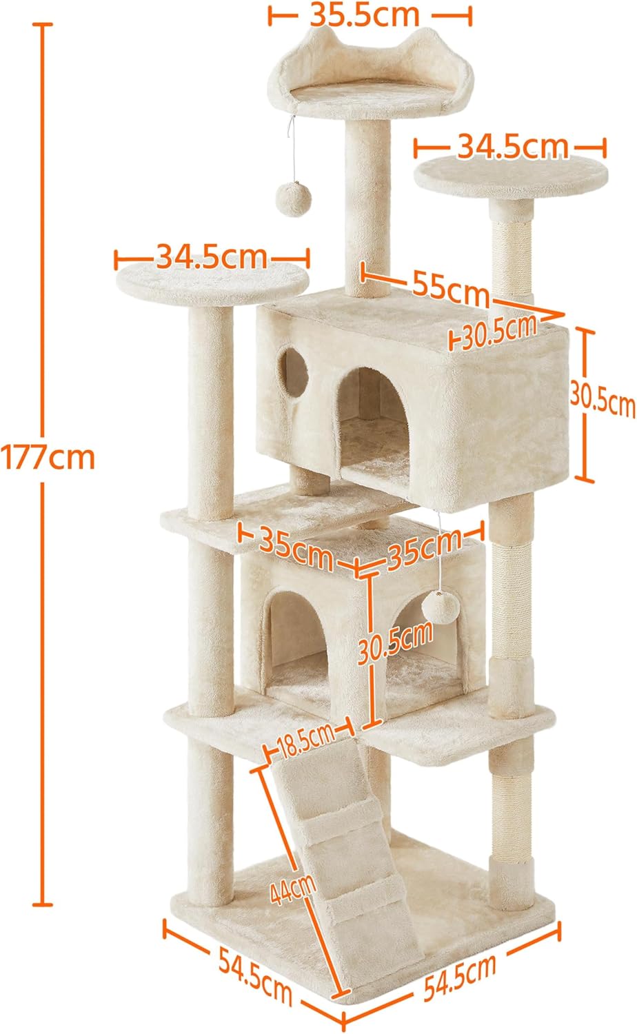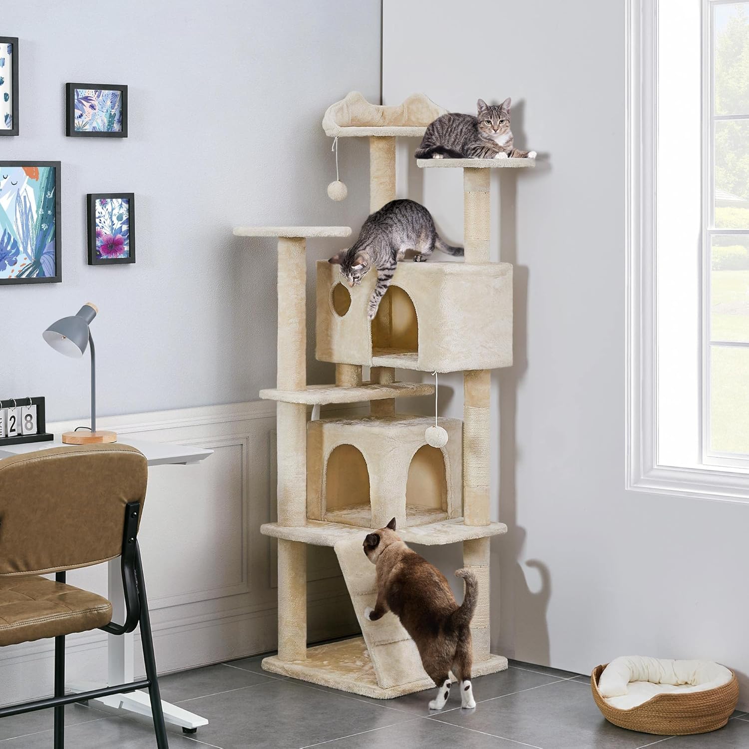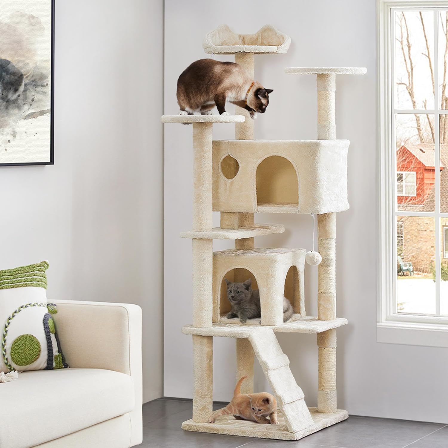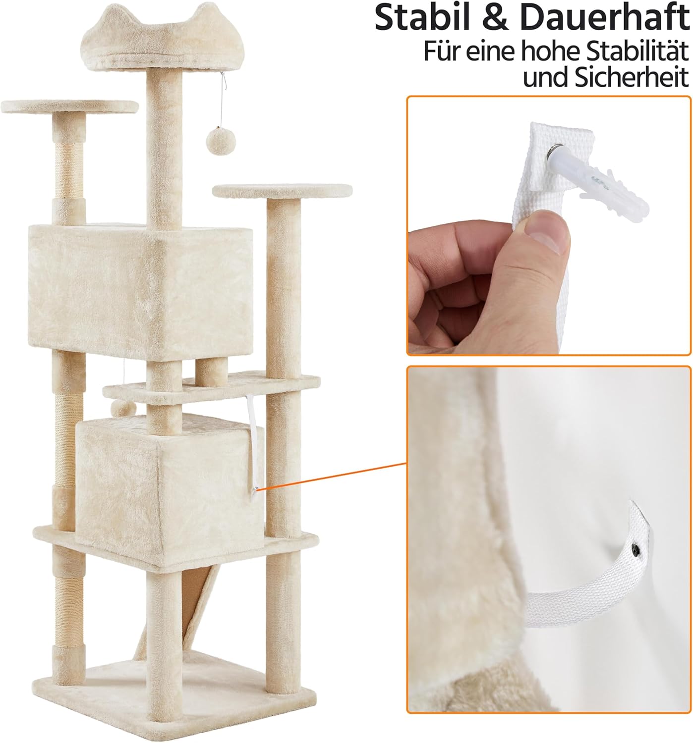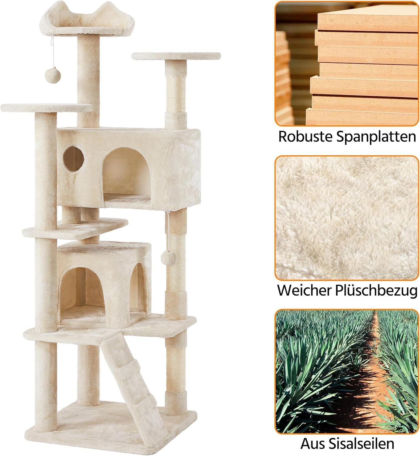 Yaheetech Голяма драскалка за котки, дърво за катерене, височина 178 см, здрава дървесина за котки с 3 платформи, 3 драскалки, 2 пещери, плюшени топки, мебели за котки, бежова