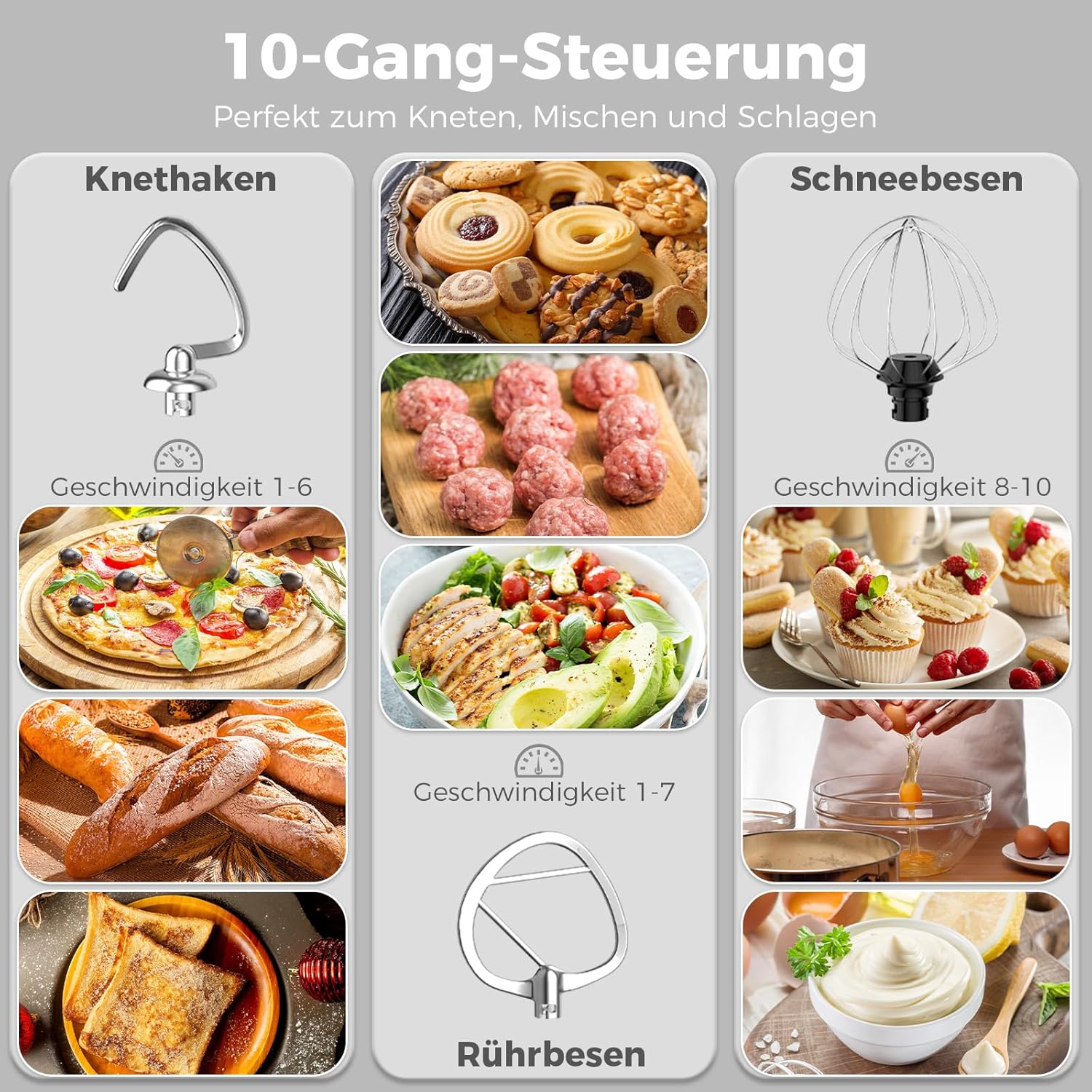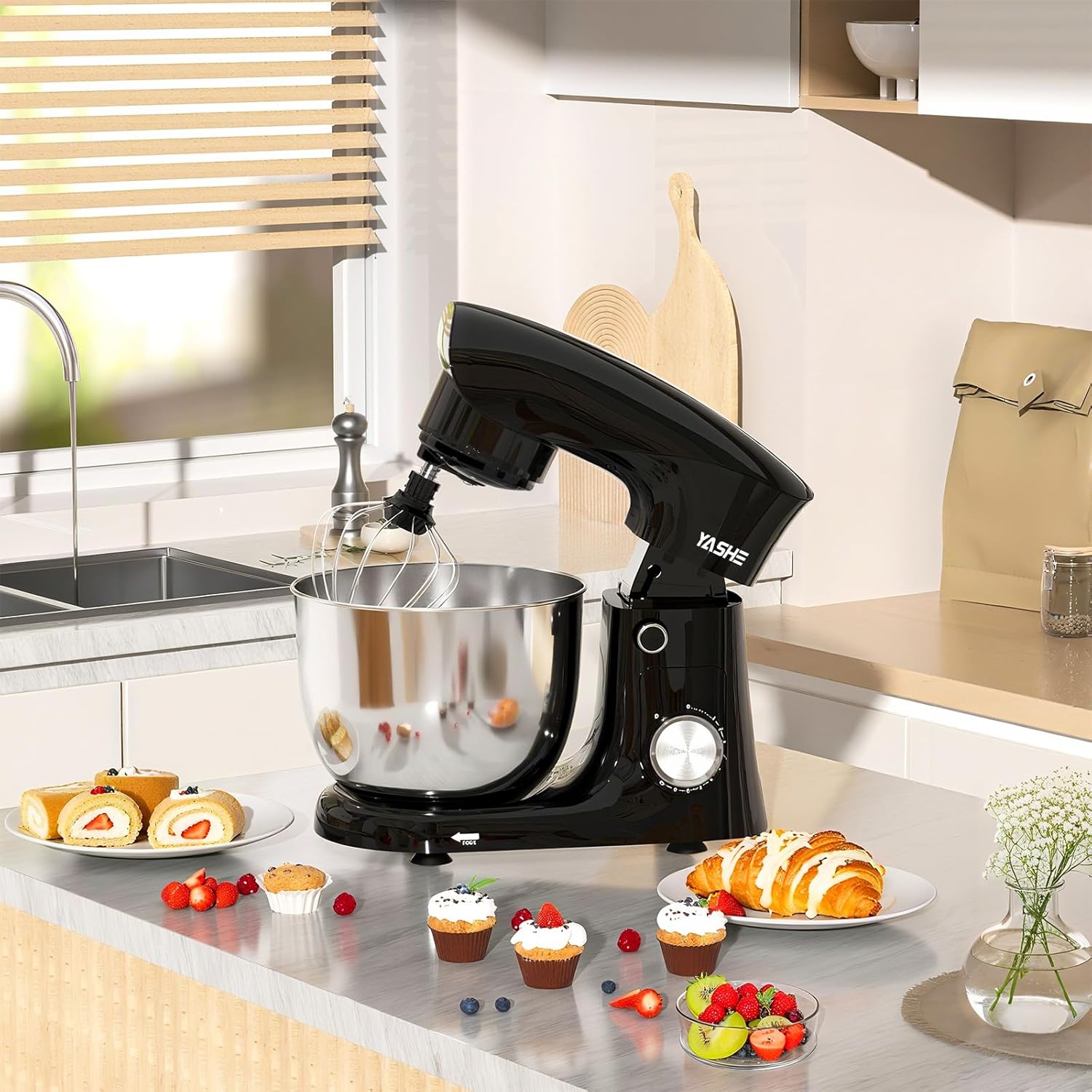 YASHE Кухненски робот 1500 W, купи от неръждаема стомана 4,5 + 5 л, 10+ скорости, накланяща се глава, с кука за тесто, бъркалка и разбиване, многофункционален кухненски робот