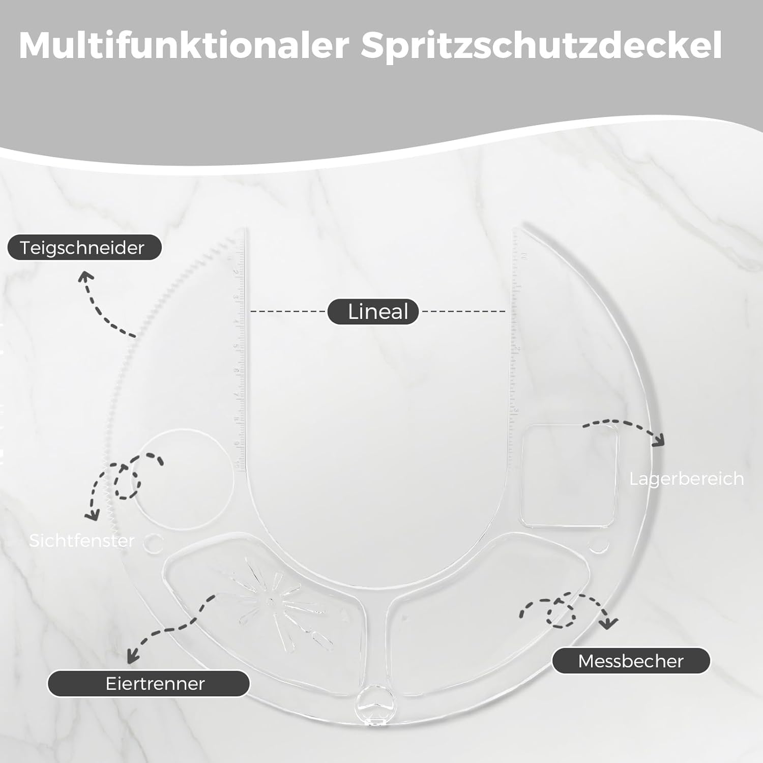 • МНОГОФУНКЦИОНАЛЕН ЗАЩИТЕН ПРЕДИ ПЛЪСКИ Иновативният предпазител от пръски YASHE е повече от просто капак. Той има вграден нож за тесто, сепаратор за яйца и плъзгач за съставки, което прави печенето по-чисто и по-практично. Така че съставките могат да се добавят без усилие.