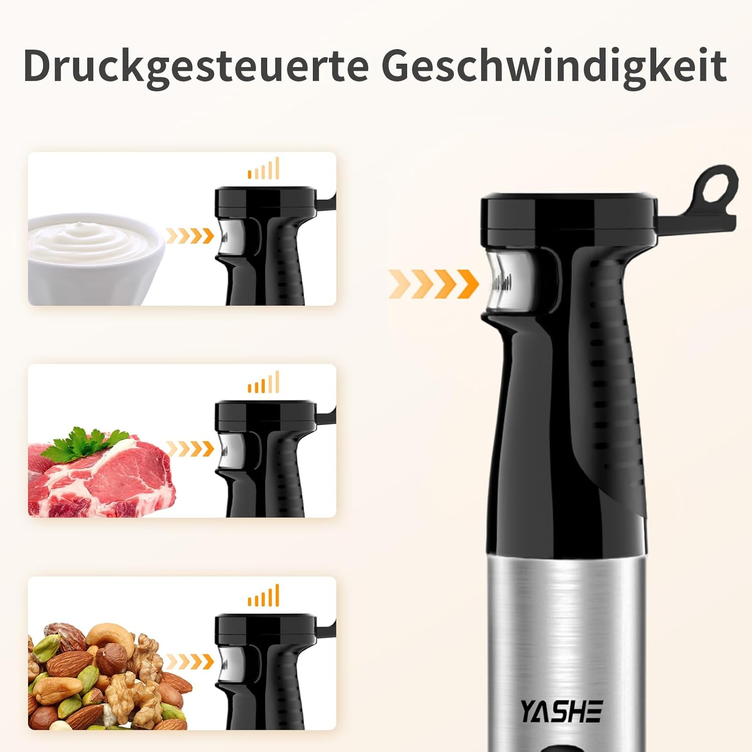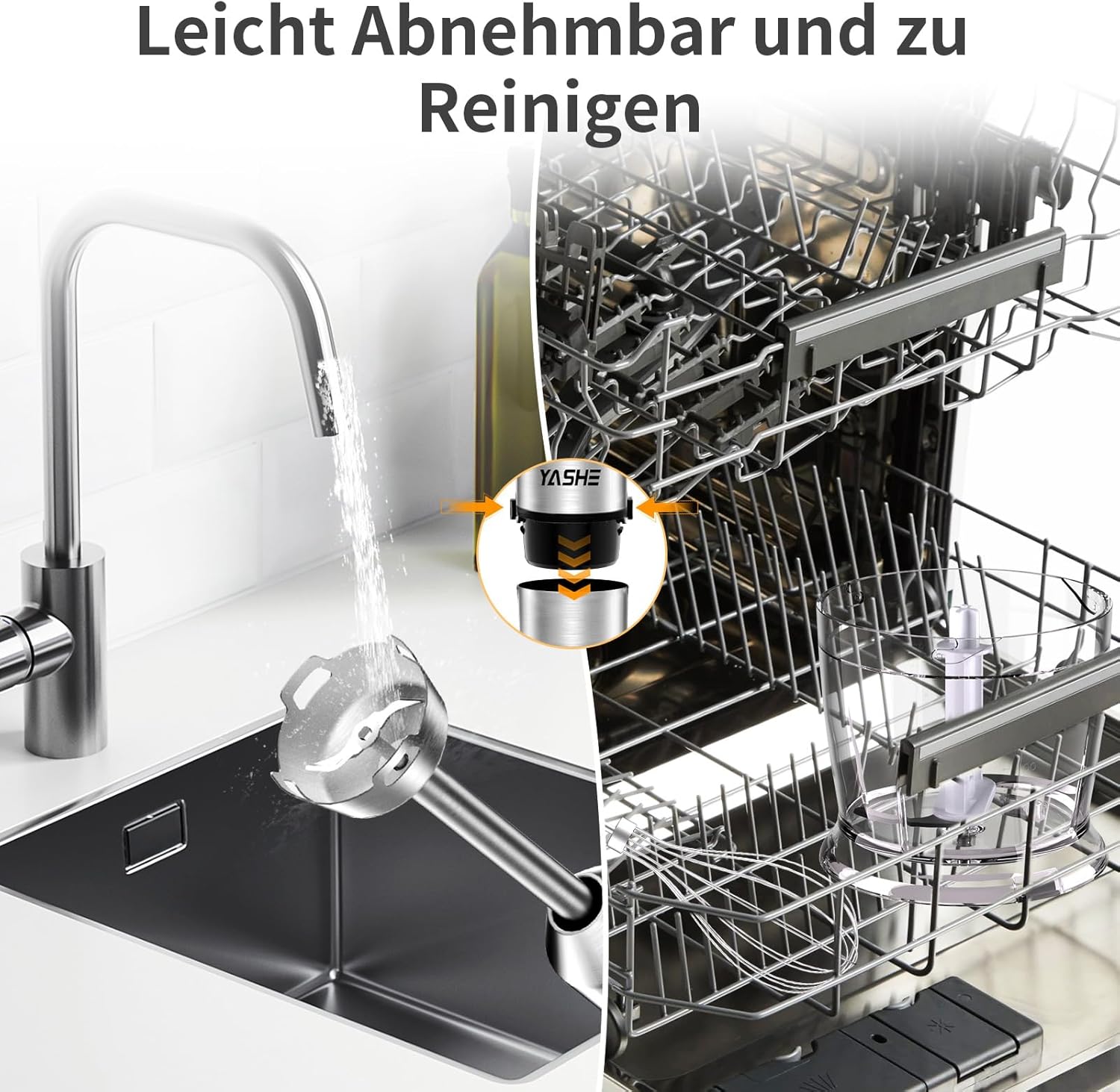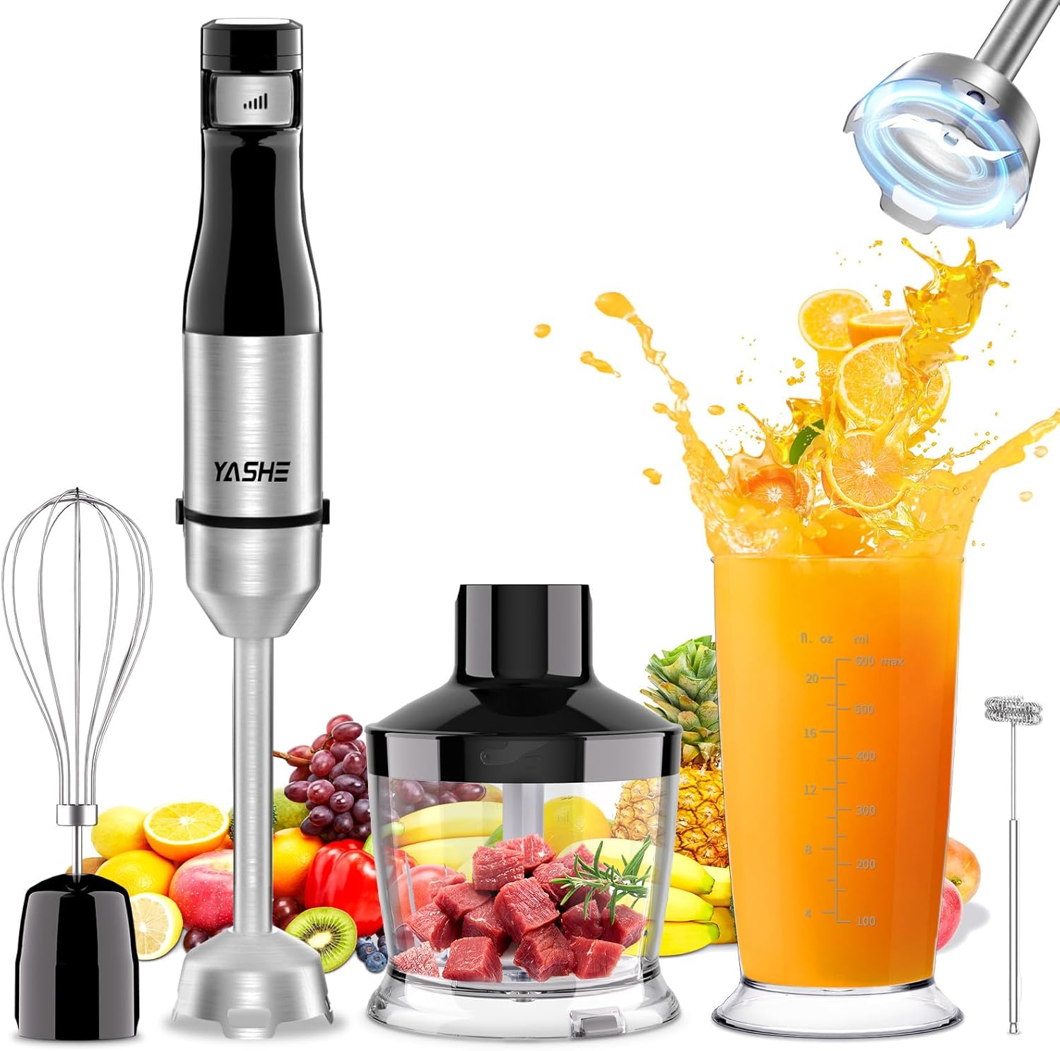 YASHE Потопяем блендер, 5-в-1 електрически ръчен блендер, 1000 W потопяем блендер, неръждаема стомана, непрекъснат контрол на скоростта, включва бъркалка, мерителна чаша - идеален за бебешка храна, сосове и супи