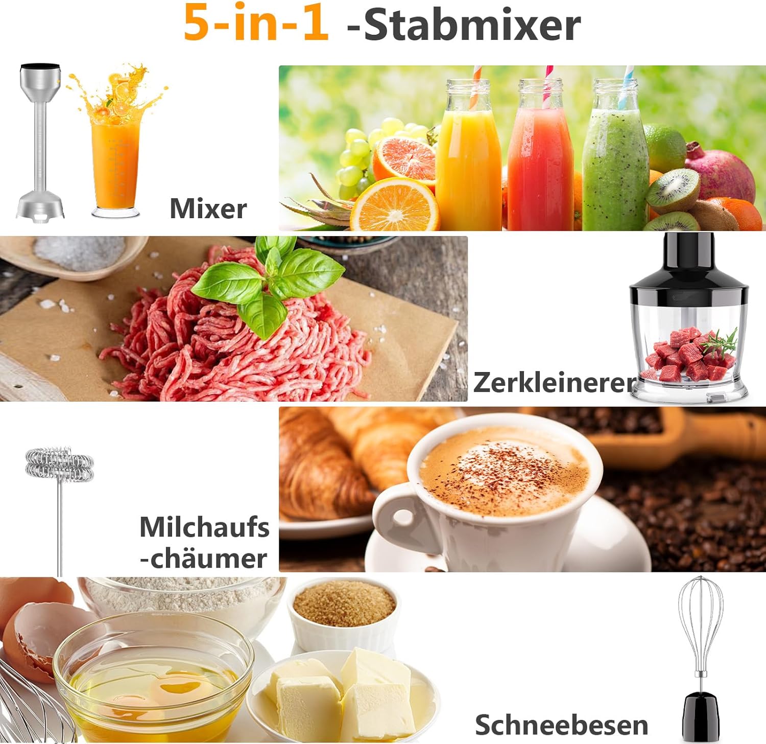 • МНОГОФУНКЦИОНАЛЕН И КОМПАКТЕН Този многофункционален ръчен пасатор разполага с 1000-ватов изцяло меден мотор, ръчен пасатор, кухненски робот с вместимост 470 мл, чаша с вместимост 600 мл, разпенител за мляко и електрическа бъркалка. Можете да го използвате за смесване, смачкване, смесване и разпенване на мляко и лесно да го съхранявате след употреба, спестявайки ценно място на кухненския плот.