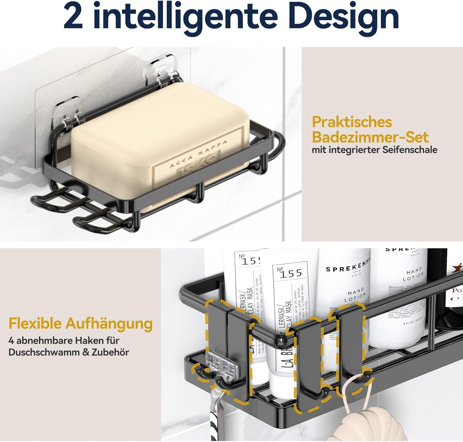 • Многофункционален рафт за душ с 8 куки: подобреният и удебелен рафт за баня е идеален за съхранение на шампоан, душ гел, крем и други препарати за миене. Органайзерът за баня може да окачи самобръсначки, кърпи, луфи, бомби за вана и други малки предмети. Рафтът за душ може да се монтира в банята, хола, кабинета и др., а също така може да се постави в кухнята за съхранение на подправки.