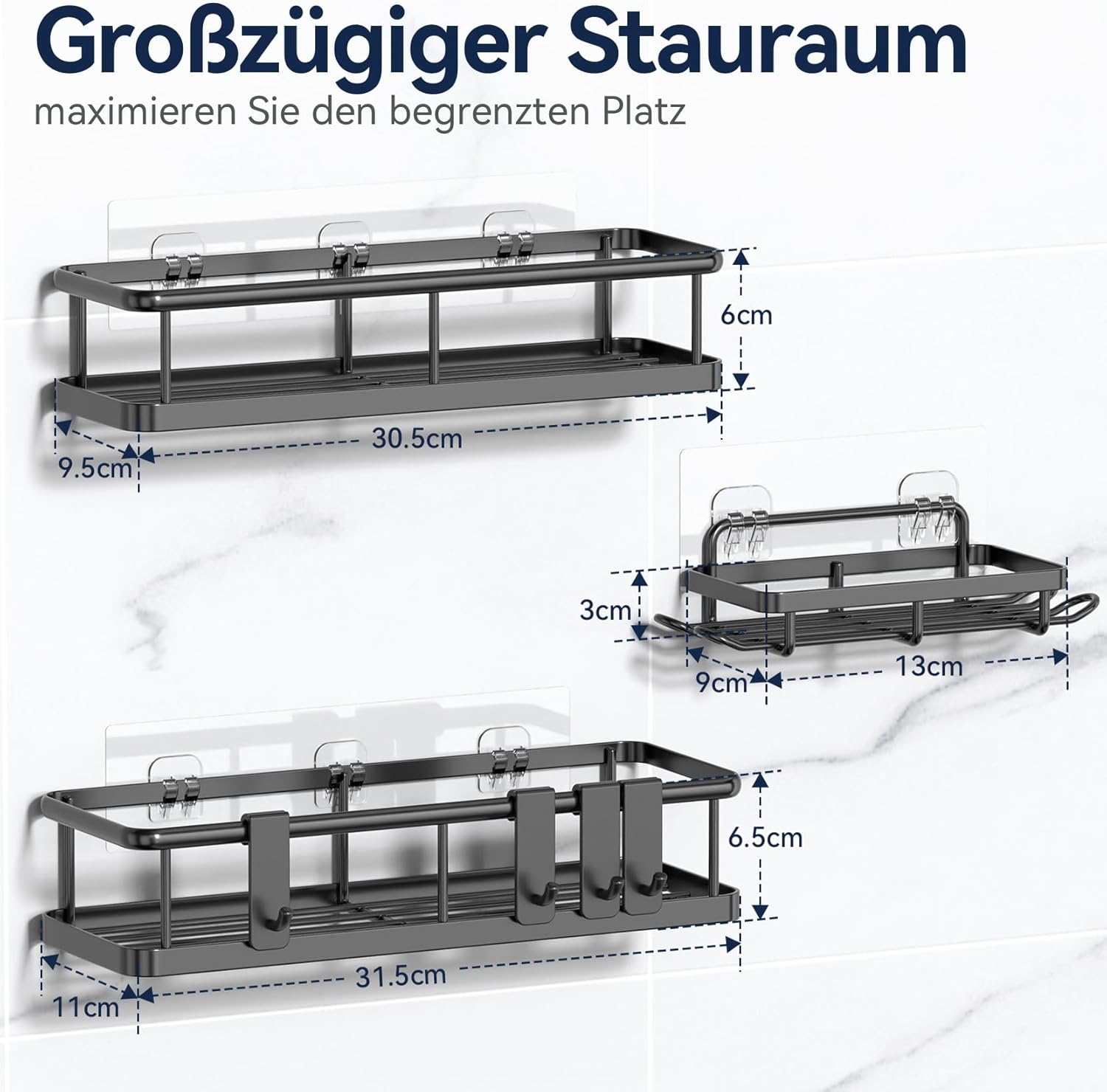 • Подобрен голям капацитет: 2 рафта за душ без пробиване (31,5 x 11 x 6,5 см / 30,5 x 9,5 x 6 см), 4 подвижни куки и 2 стикера. Дизайнът на рафта за баня е подобрен и капацитетът е увеличен с 30%. Повдигнатият предпазен парапет може ефективно да предотврати падането на вашите предмети. Стенната страна на рафта за душ е оборудвана с 2 кръгли мъниста, за да се предотврати преобръщането на бутилките.