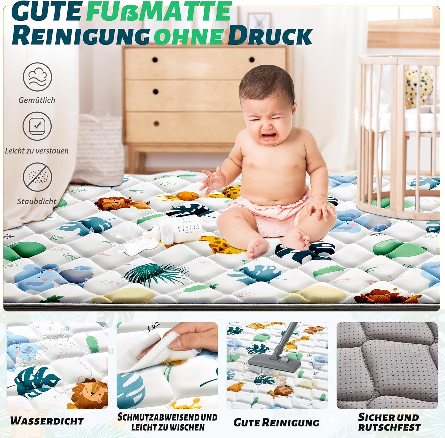 • УНИКАЛЕН ДИЗАЙН: Тази постелка за игра от памук и полиестер е мека, щадяща кожата и нетоксична. По-голямата релефна площ я прави плюшена и удобна, а зашитите и подсилени ръбове осигуряват издръжливост. Неплъзгащият се дизайн на дъното гарантира, че бебетата могат да играят свободно, без да се подхлъзват, и е нежна към пода.