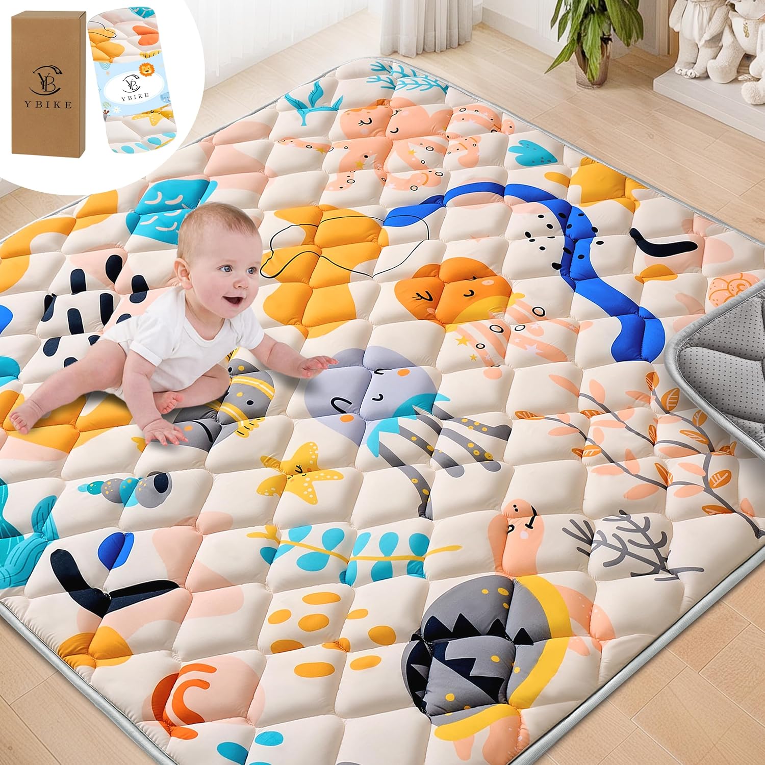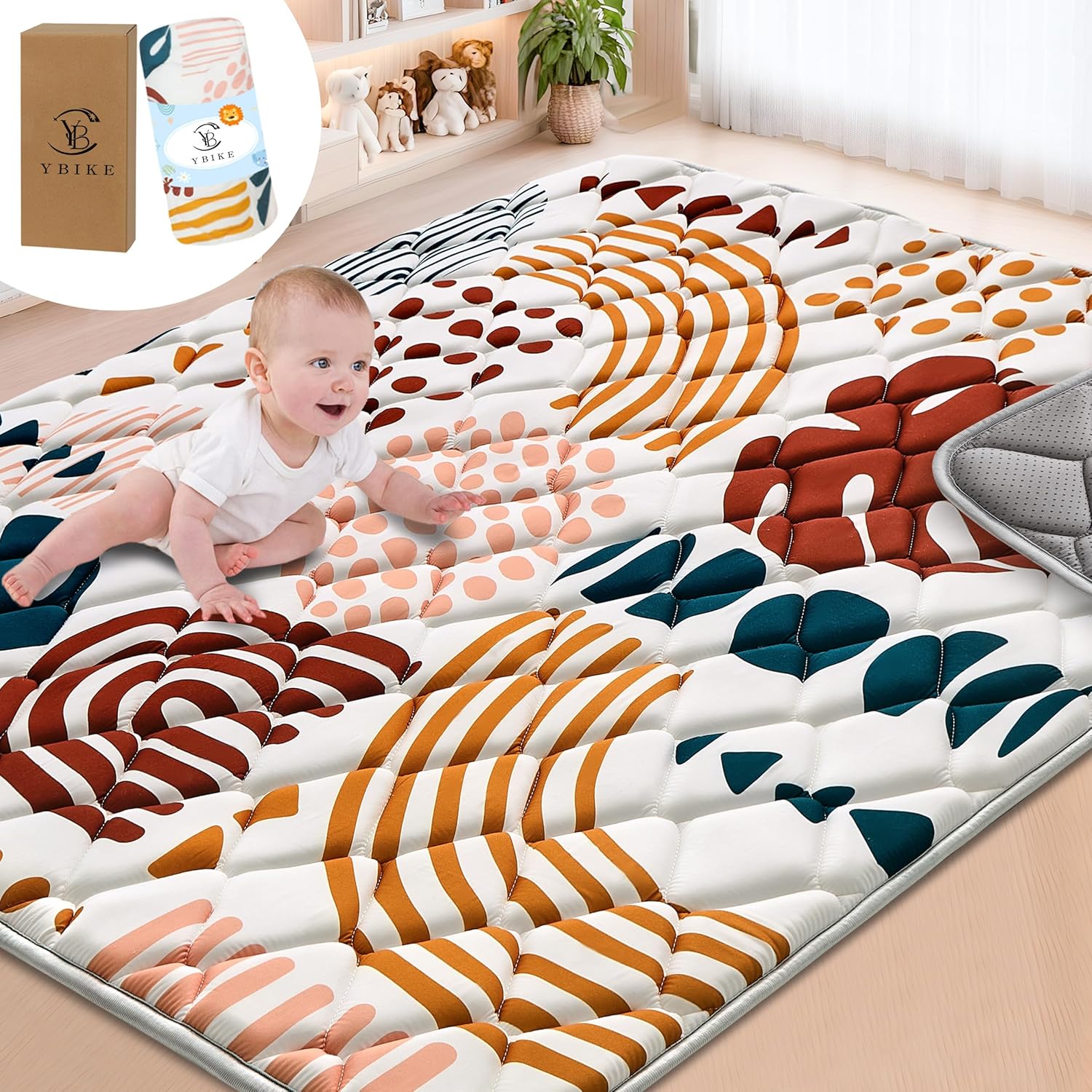 • УНИКАЛЕН ДИЗАЙН: Тази постелка за игра от памук и полиестер е мека, щадяща кожата и нетоксична. По-голямата релефна площ я прави плюшена и удобна, а зашитите и подсилени ръбове осигуряват издръжливост. Неплъзгащият се дизайн на дъното гарантира, че бебетата могат да играят свободно, без да се подхлъзват, и е нежна към пода.