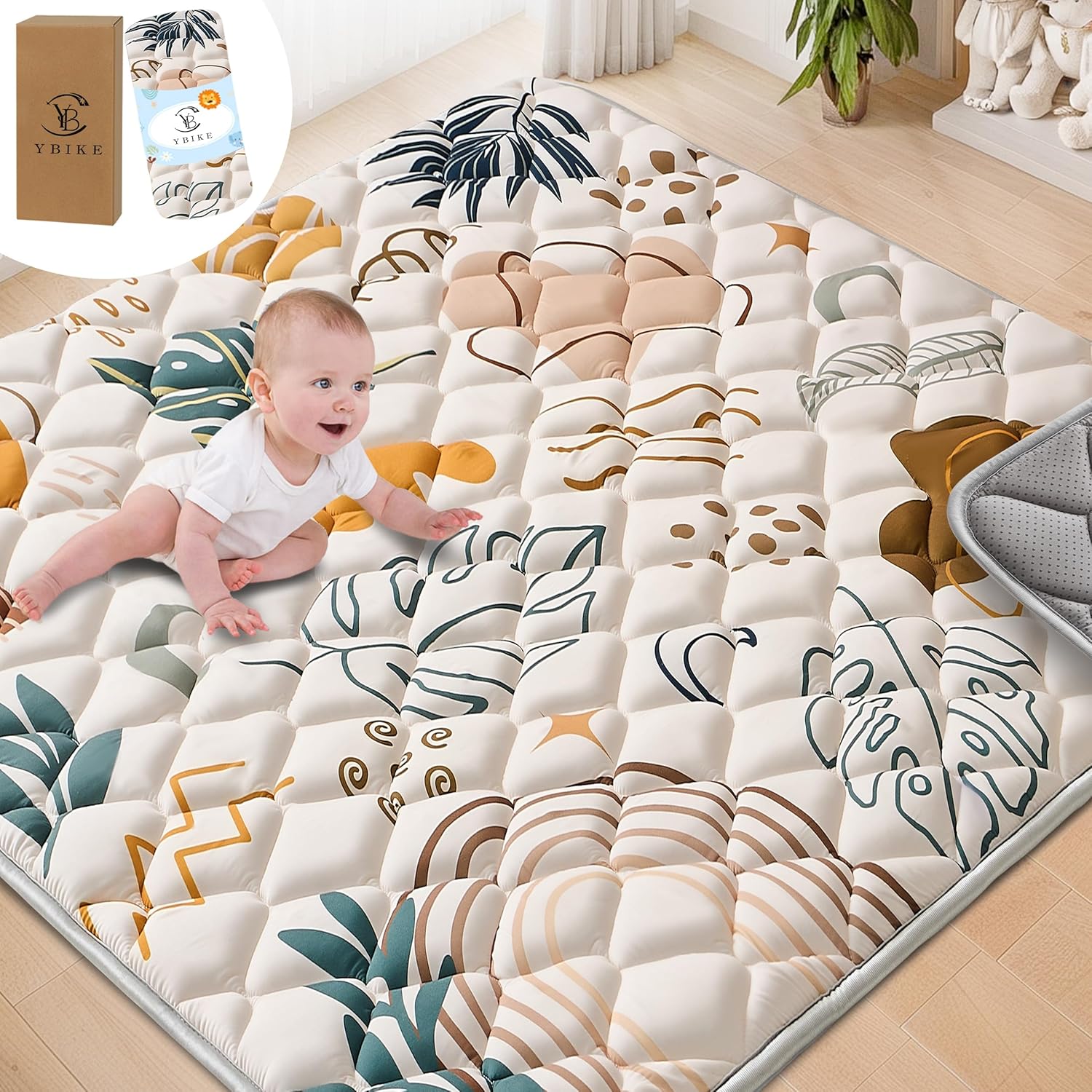 YBIKE Бебешка постелка за игра, Сгъваема голяма, неплъзгаща се, дебела постелка за пълзене за бебета 150x150 см, Преносима мека постелка за време на коремче, Переща се постелка за дейности за деца (бохо листа)