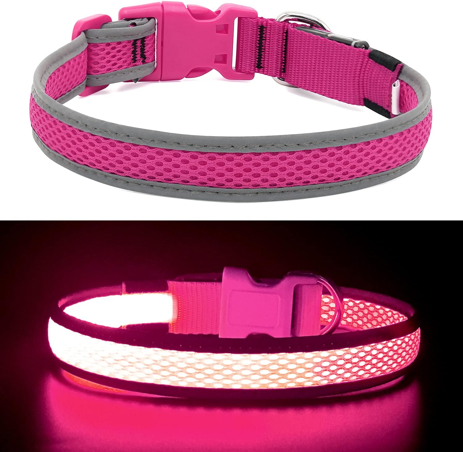 YFbrite Светещ нашийник за кучета, Презареждащ се LED нашийник за кучета, Мигащ нашийник за кучета, Регулируем светлоотразителен нашийник за кучета, Безопасно светене през нощта (Розов, M)