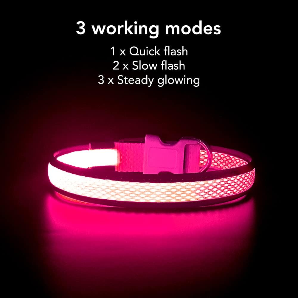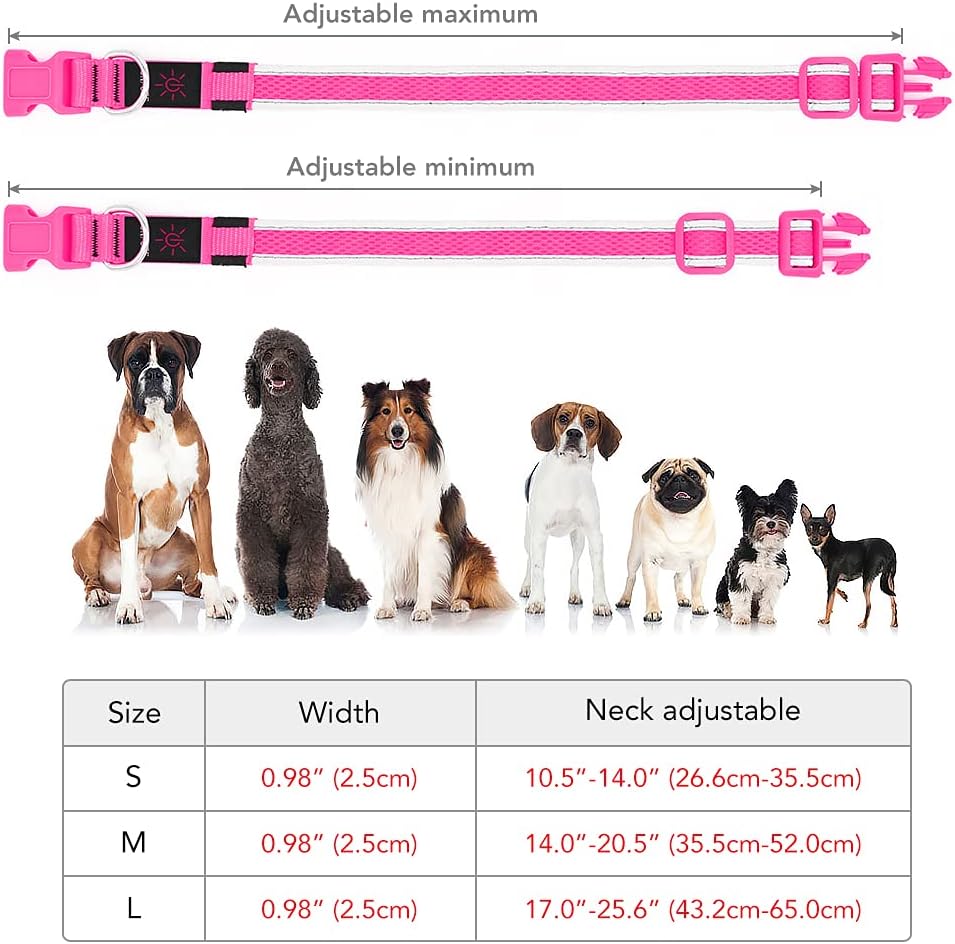 YFbrite Светещ нашийник за кучета, Презареждащи се LED нашийници за кучета, Мигащи регулируеми светлоотразителни нашийници за кучета, Безопасно светене през нощта (Розов, S)