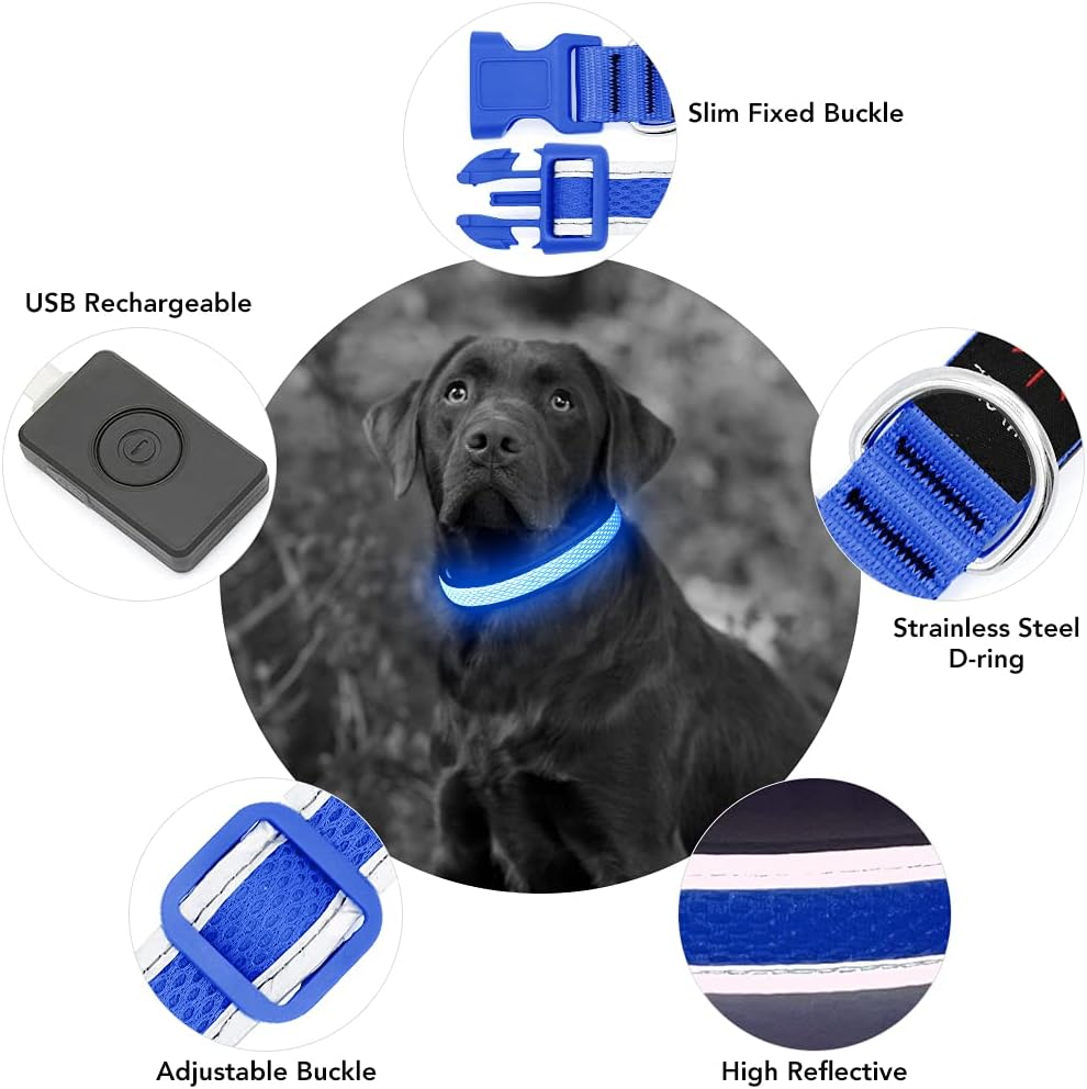 YFbrite Светещ нашийник за кучета, Презареждащи се LED нашийници за кучета, Мигащи регулируеми светлоотразителни нашийници за кучета, Безопасно светене през нощта (Син, S)
