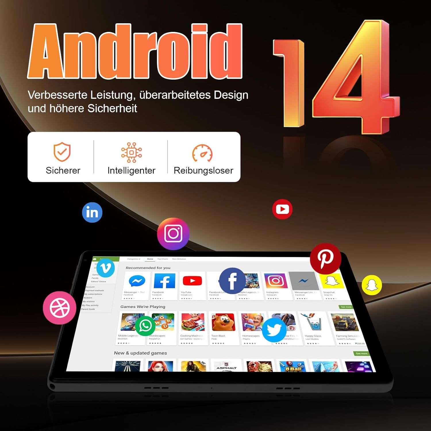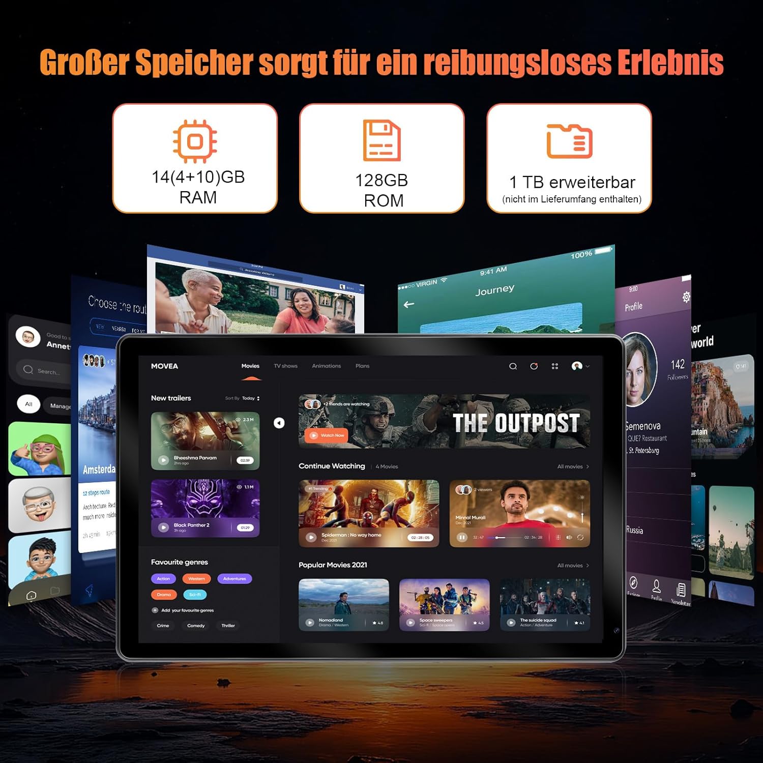 • 【14GB RAM + 128GB ROM + 1TB TF】10-инчовият таблет е оборудван с Octa Core чип, съчетан с 14GB (4+10) RAM, осигурявайки светкавично бърза производителност за игри, стрийминг и сърфиране. Съвместим с 1TB micro SD/TF карти, независимо дали използвате таблета за работа или учене, превключването между различни приложения е супер лесно. (Micro SD/TF картата не е включена)