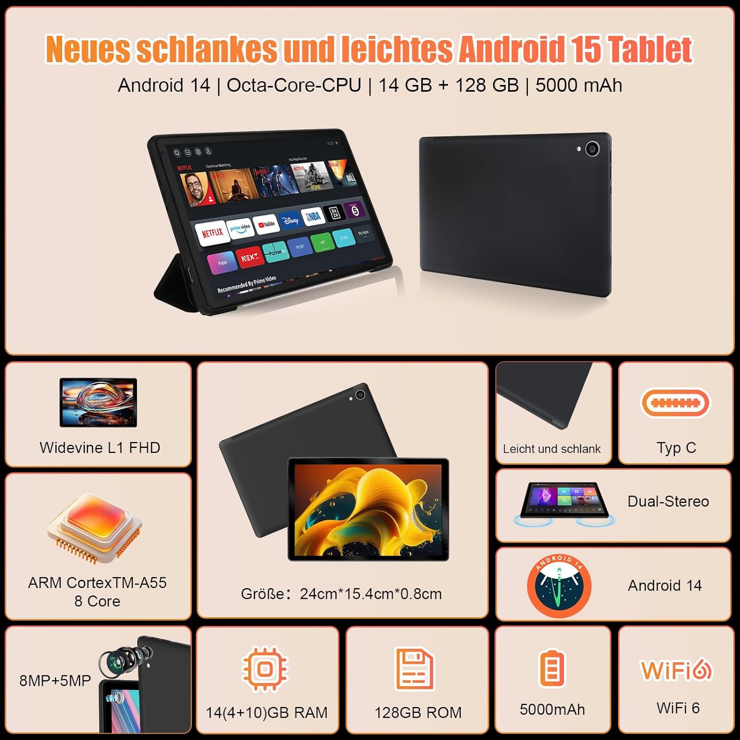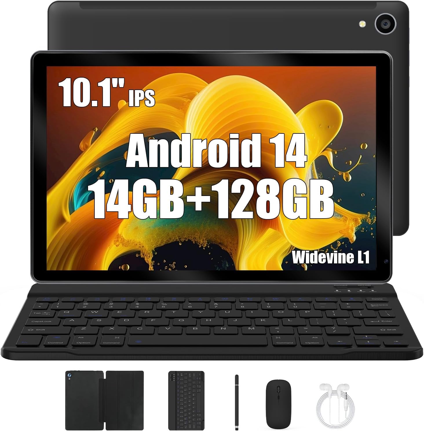 Yicty Android 14 таблети 10-инчов таблетен компютър, 14(4+10) GB RAM + 128GB ROM (1TB TF), Octa Core 2.0 GHz/1280 * 800 HD IPS/WiFi 6/BT 5.3/5000mAh/5MP+8MP/OTG/Type C жак за слушалки, таблет с клавиатура