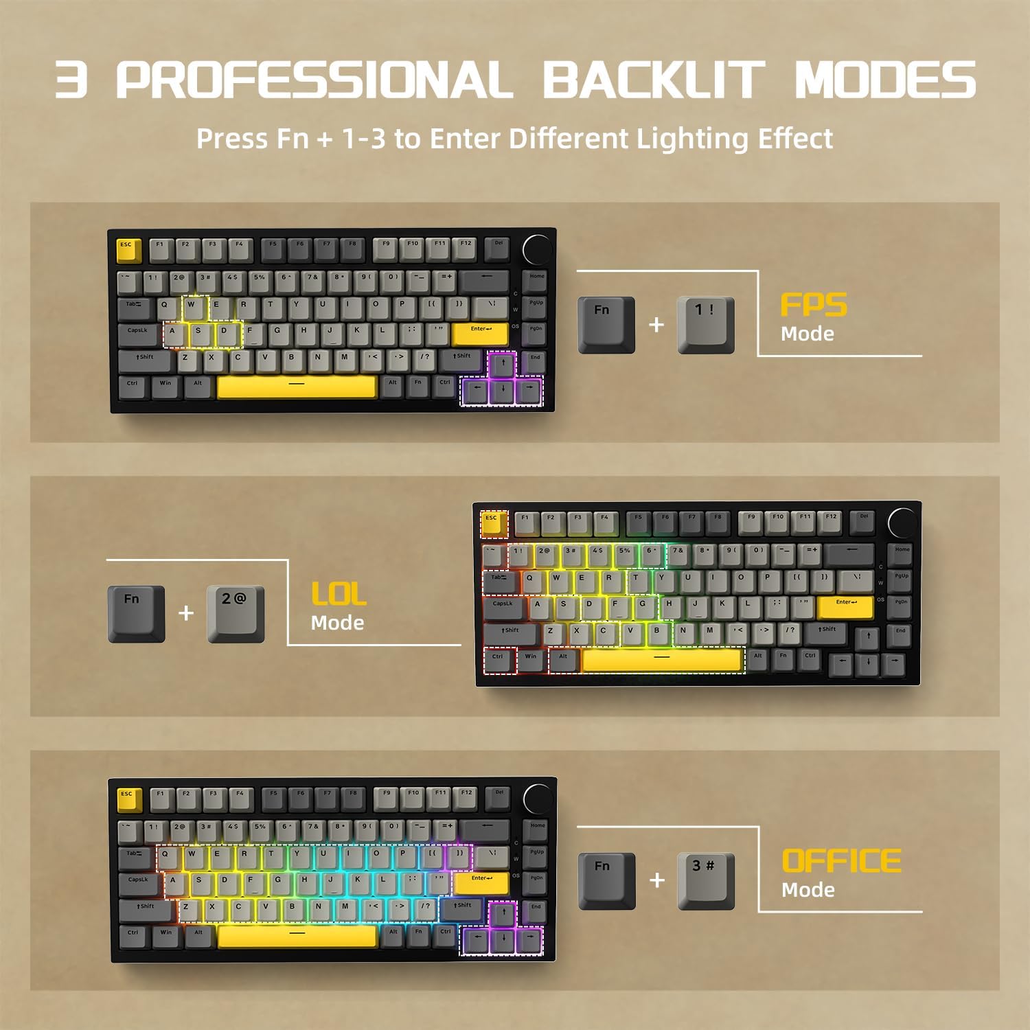 • 【75% ANSI оформление и дизайн на бутоните】Възползва се най-популярното 75% AINSI оформление с 81 клавиша, което го прави практичен избор за работа/игри. Лесно управление с вградения CNC алуминиев контрол на силата на звука. Завъртете го наляво/надясно, за да промените силата на звука, натиснете бутона, за да включите/изключите светлината. Също така регулирайте бутона поотделно.