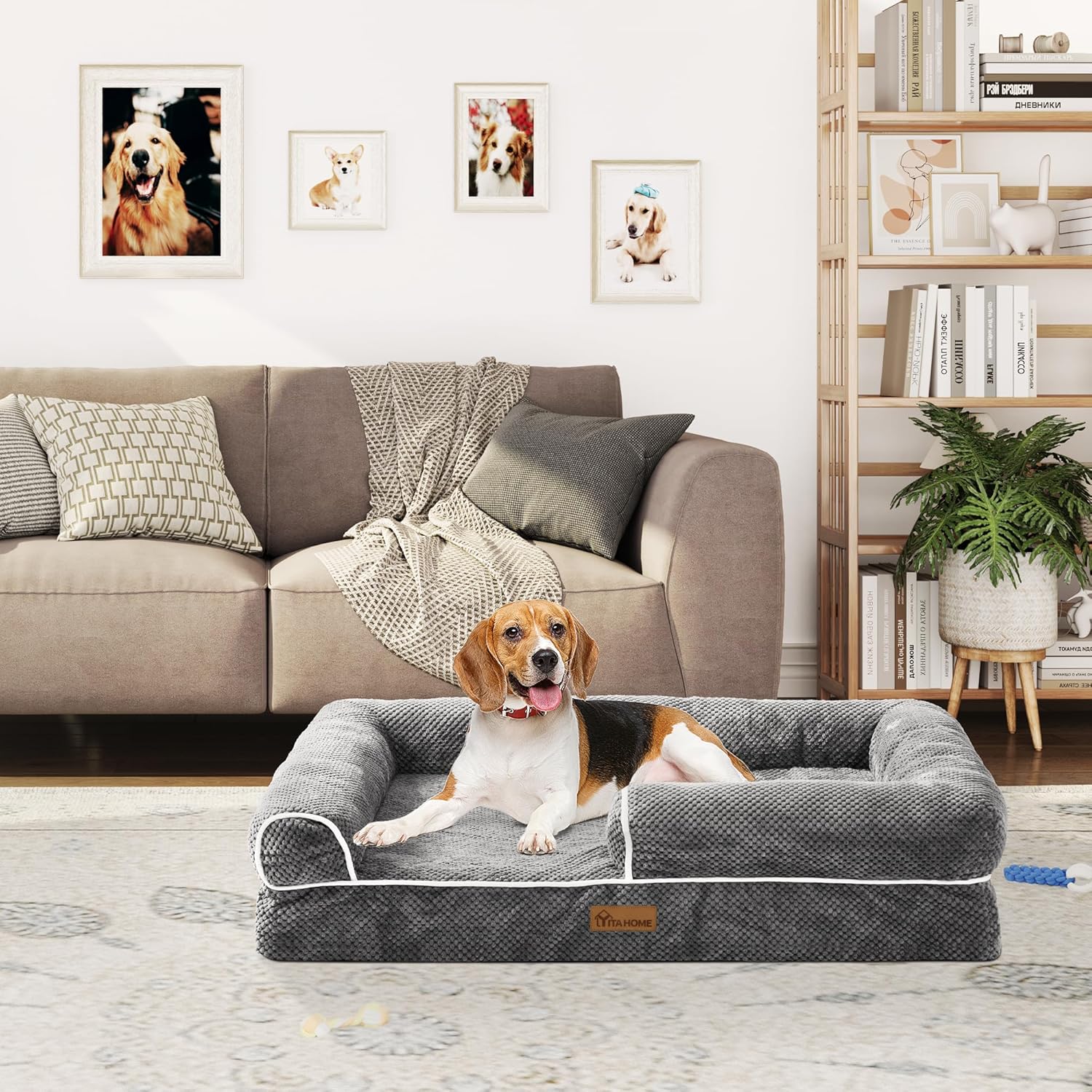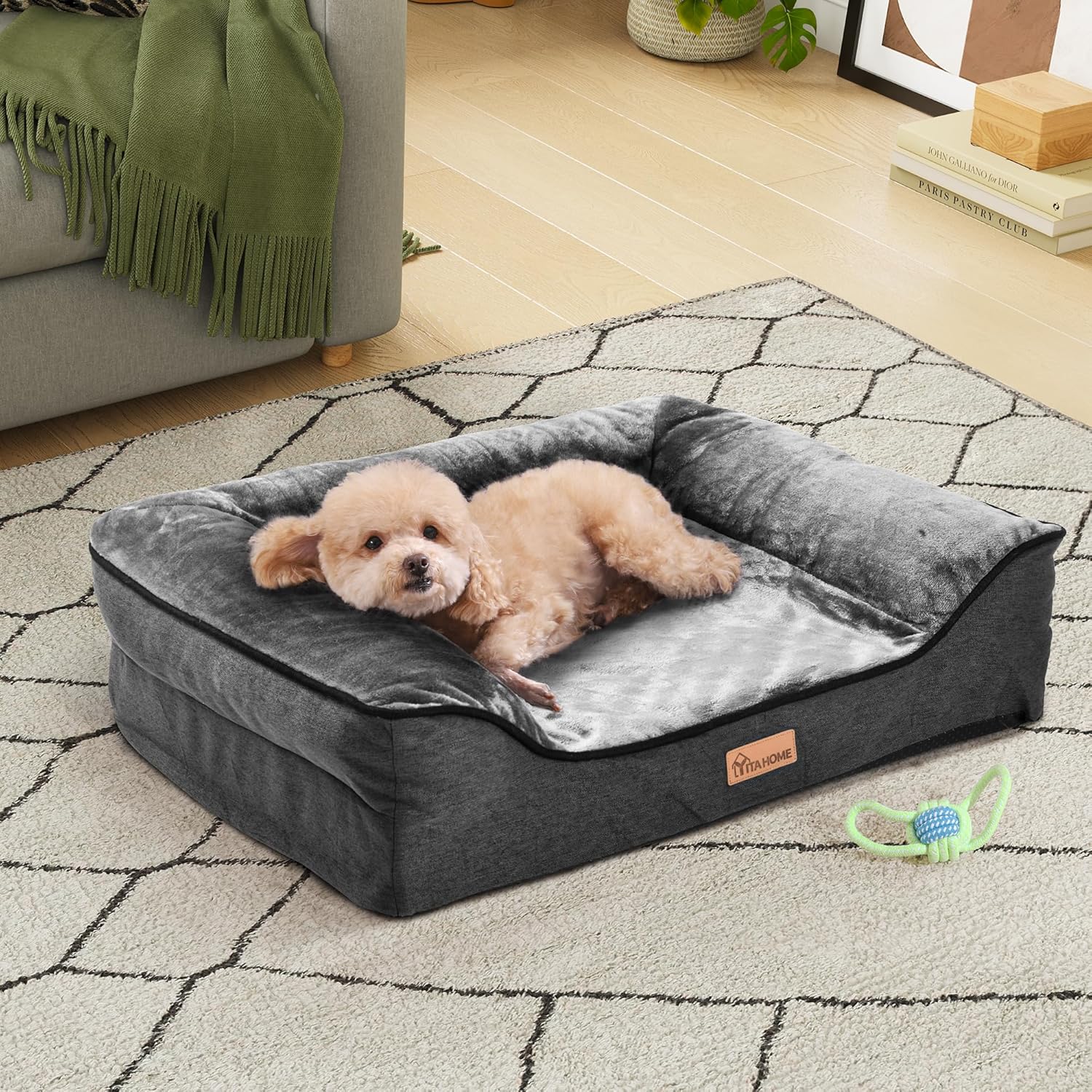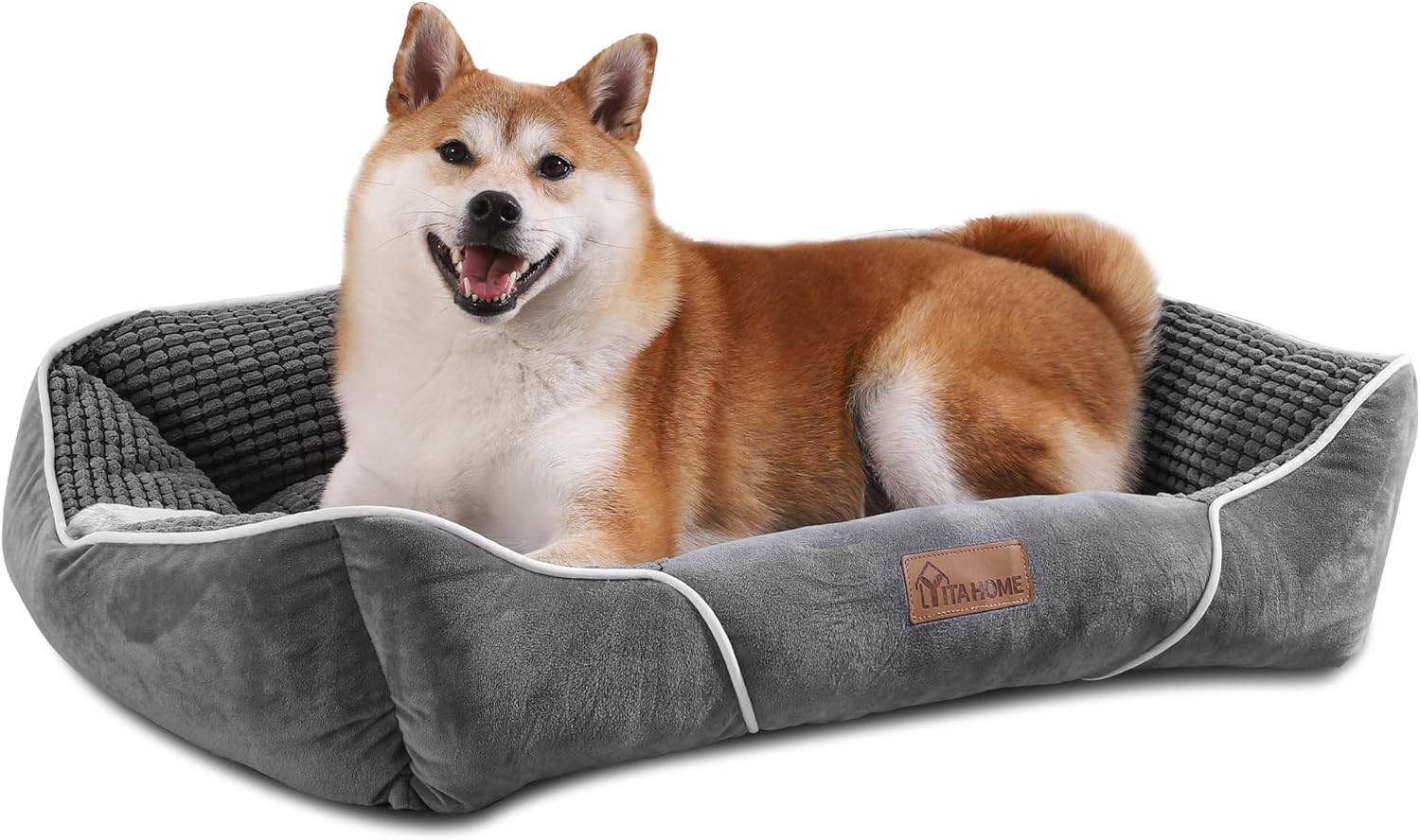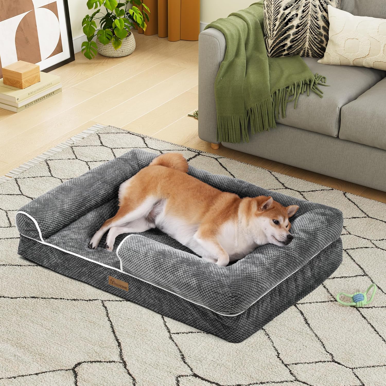 YITAHOME Кучешко легло, Ергономичен диван за кучета, Кучешки диван, Мек, Малък плюш от царевични зърна, Плътна странична подплата, За кучета със среден размер, Може да се пере, Неплъзгащи се кучешки легла, 89 x 63 см, Сив