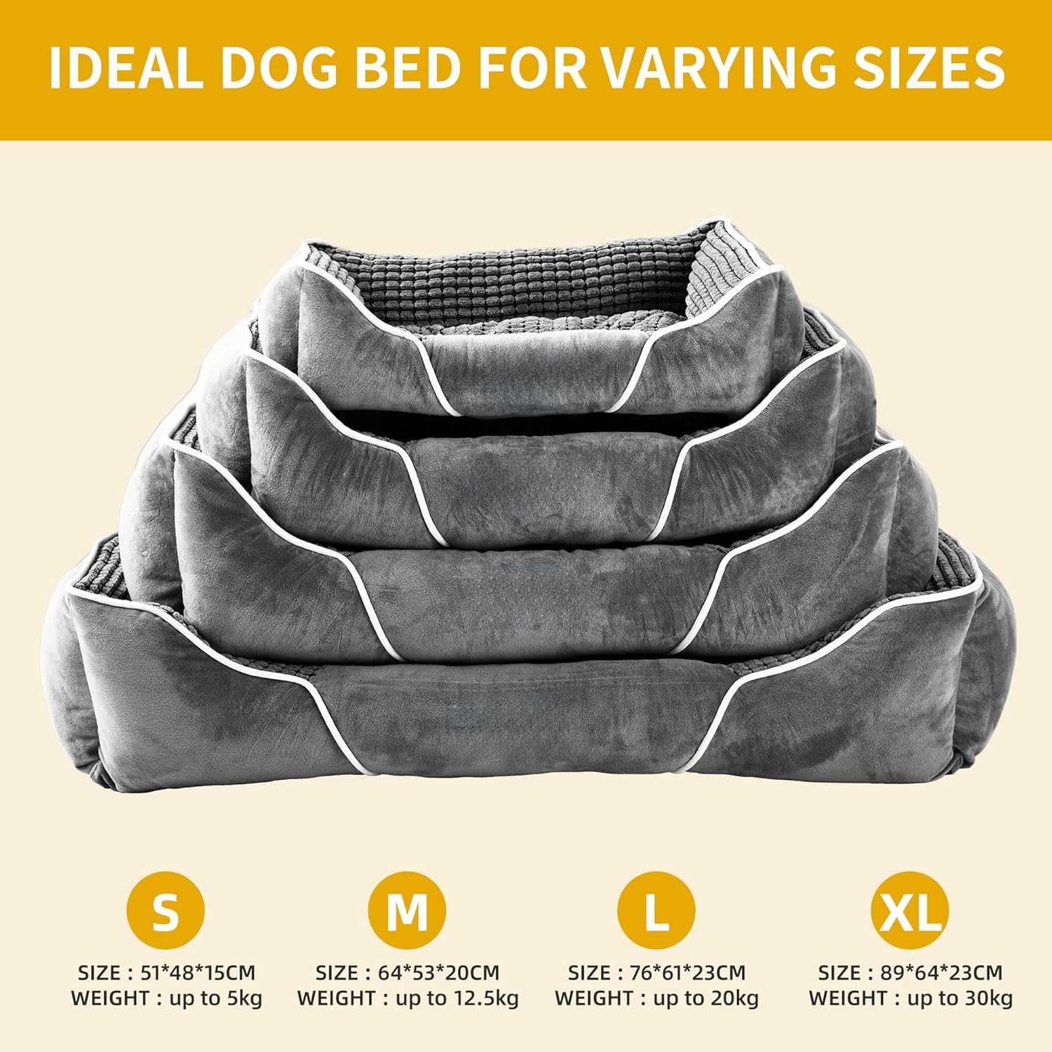 • Разнообразие от размери, от които да избирате: Предлагат се 4 различни размера, от които да избирате, които са много подходящи за големи, средни и кучета или котки. S (51 x 48 x 15 см, подходящ за домашни любимци до 5 кг); M (64 x 53 x 20 см, подходящ за домашни любимци до 12,5 кг); L (76 x 61 x 23 см, подходящ за домашни любимци до 20 кг); XL (89 x 64 x 23 см, подходящ за домашни любимци до 30 кг).