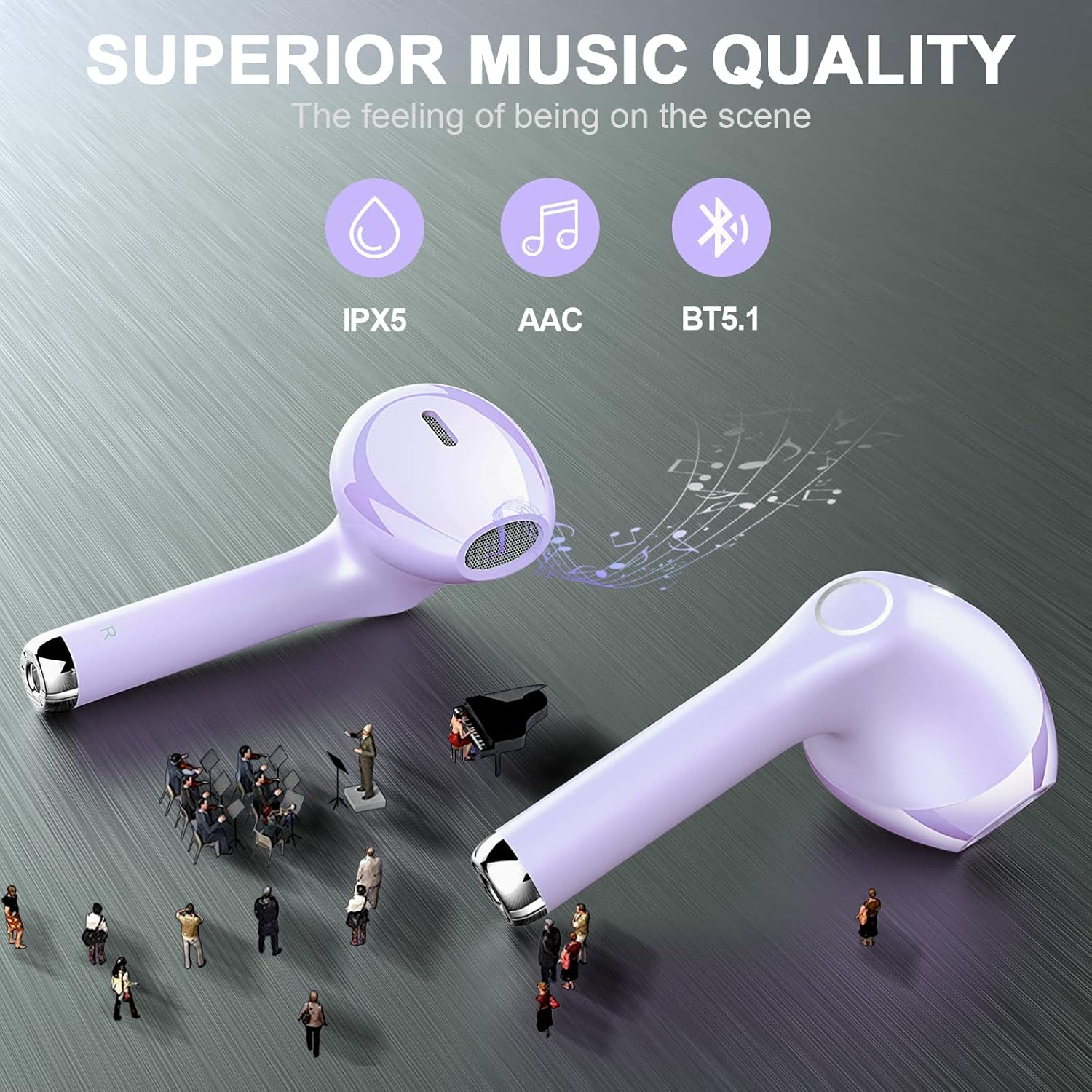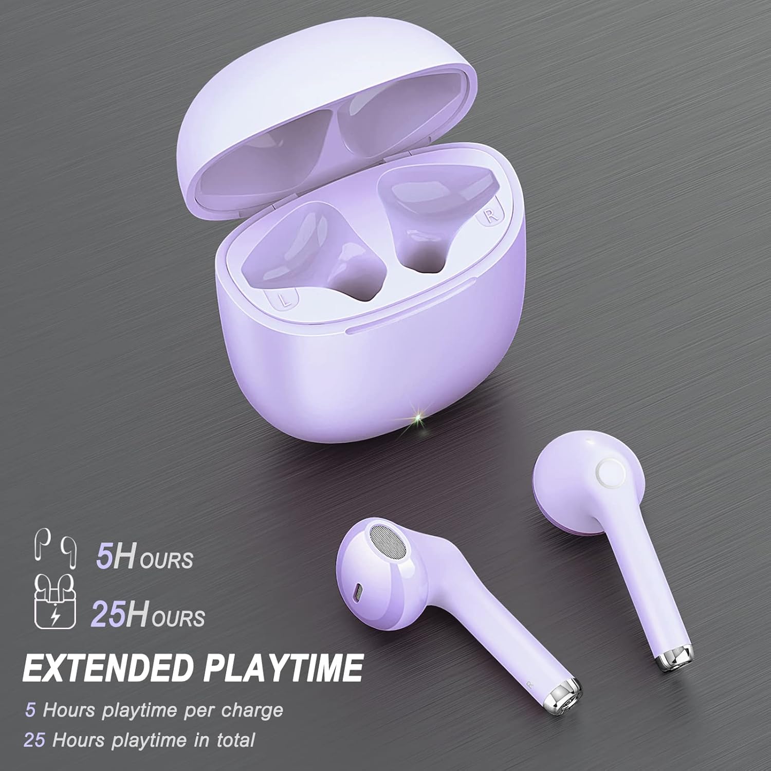 • Дълъг живот на батерията: Bluetooth слушалките осигуряват до 5 часа висококачествен звук с едно зареждане, а включеният калъф за зареждане осигурява допълнителни 4 зареждания, което дава общо 25 часа време за възпроизвеждане.