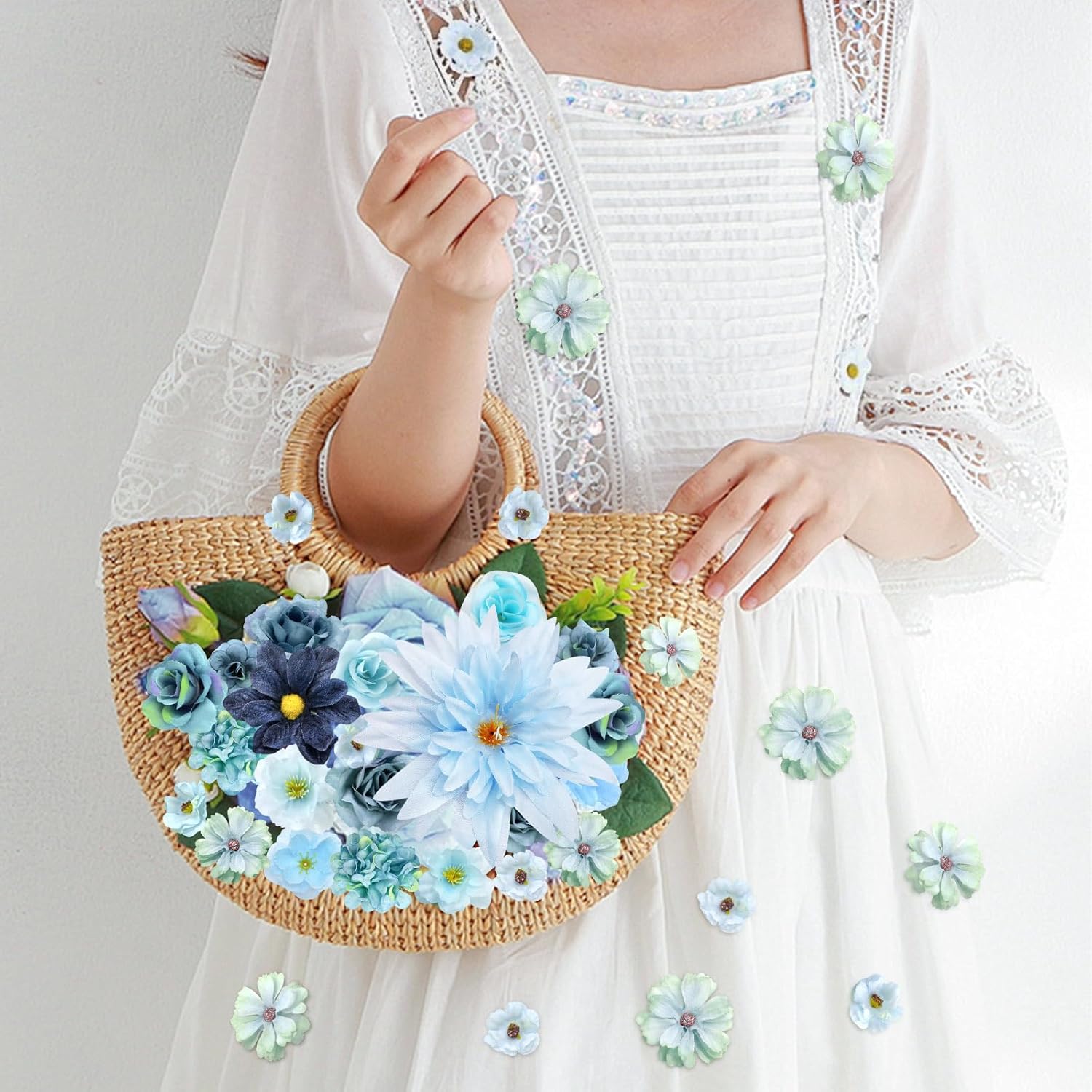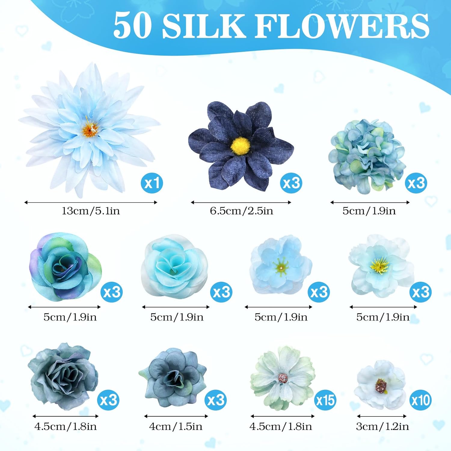 • Изкуствени цветя: 50 броя платнени цветя вътре, изкуствени цветя като истински с диаметър 4,5~10,5 см, богато количество, пълни стилове, подходящи за всякакви цветя „Направи си сам“ декорация