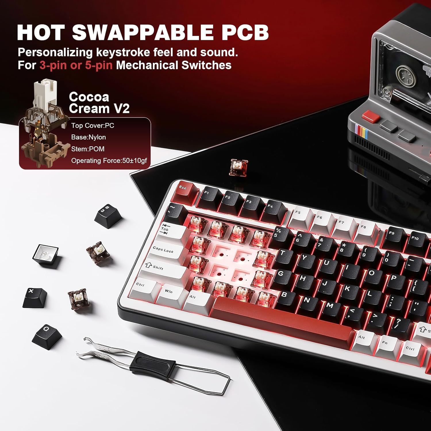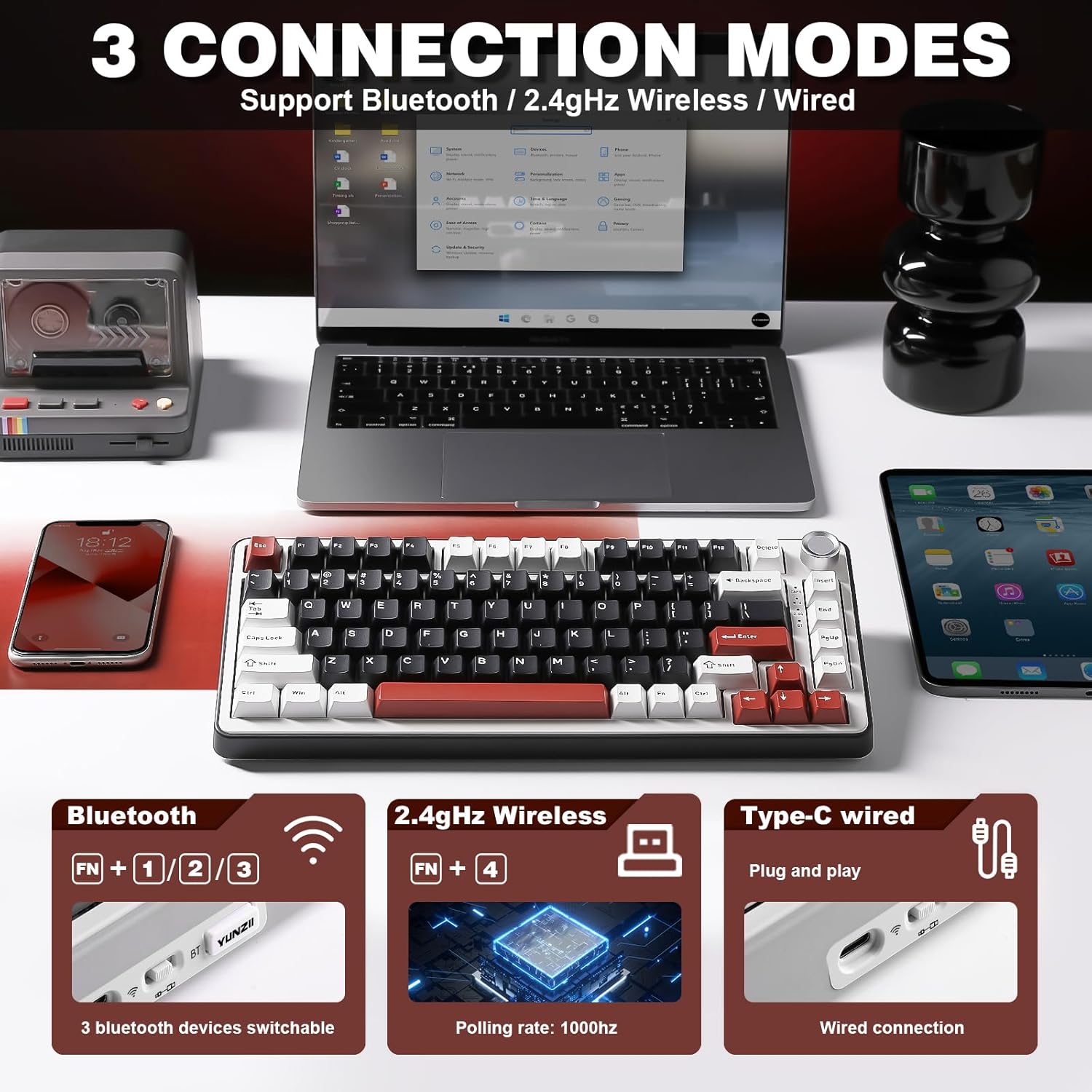 YUNZII B75 PRO Безжична механична клавиатура, 75% уплътнение за геймърска клавиатура, клавиатура за гореща смяна с бутони, предварително смазани RGB превключватели, BT/Type-C/2.4G кремообразна клавиатура (Cocoa Cream V2 превключвател, черен)