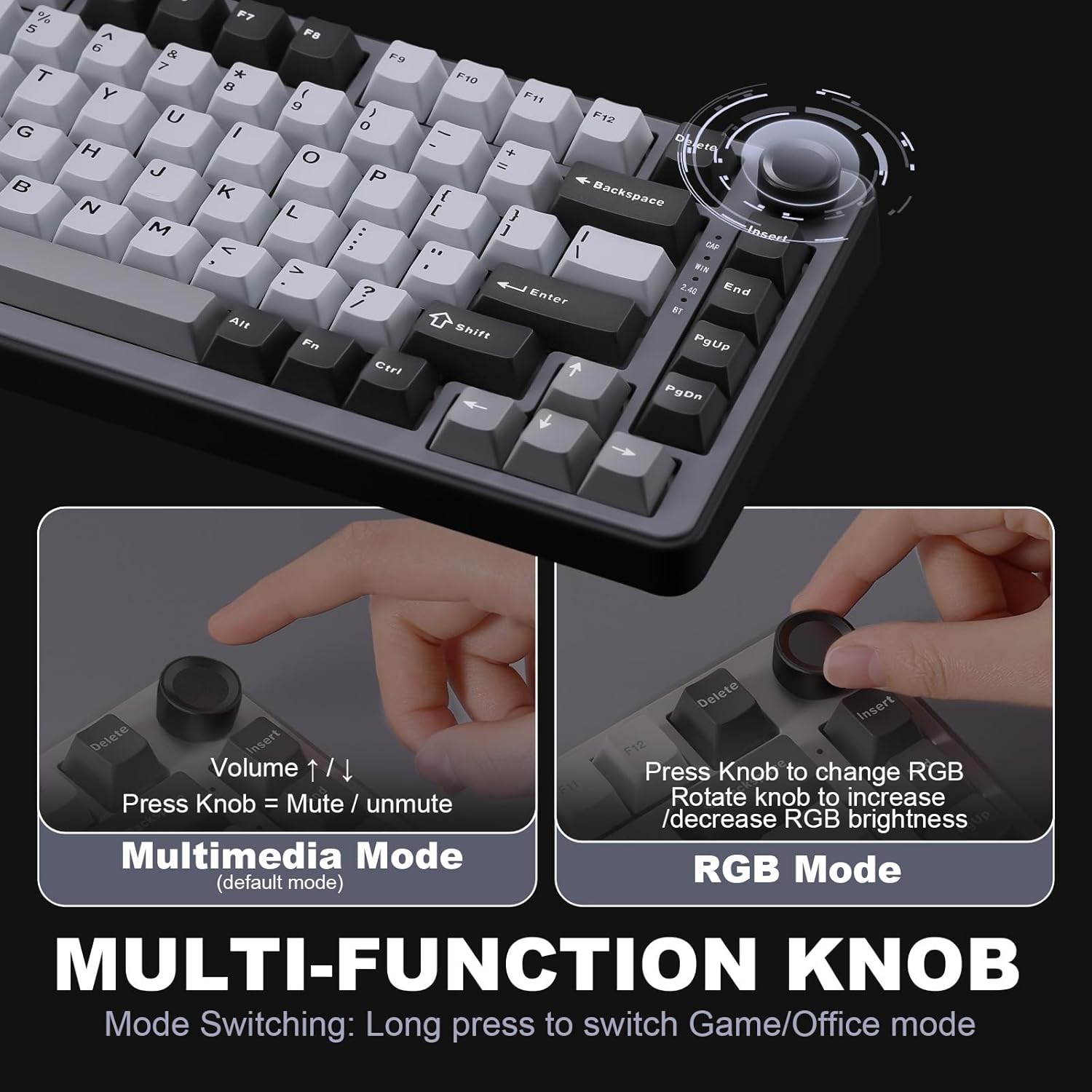 • 75% клавиатура с бутон: B75 PRO е компактна клавиатура с бутон и 82 клавиша. Клавиатурата TKL има едновременно цифрови клавиши, функционални клавиши и клавиши със стрелки. С многофункционалния бутон можете бързо да регулирате силата на звука и подсветката. Чрез продължително натискане на бутона можете да превключвате между режим за игра и офис, а чрез завъртане на бутона можете да регулирате силата на звука на клавиатурата и RGB подсветката.
