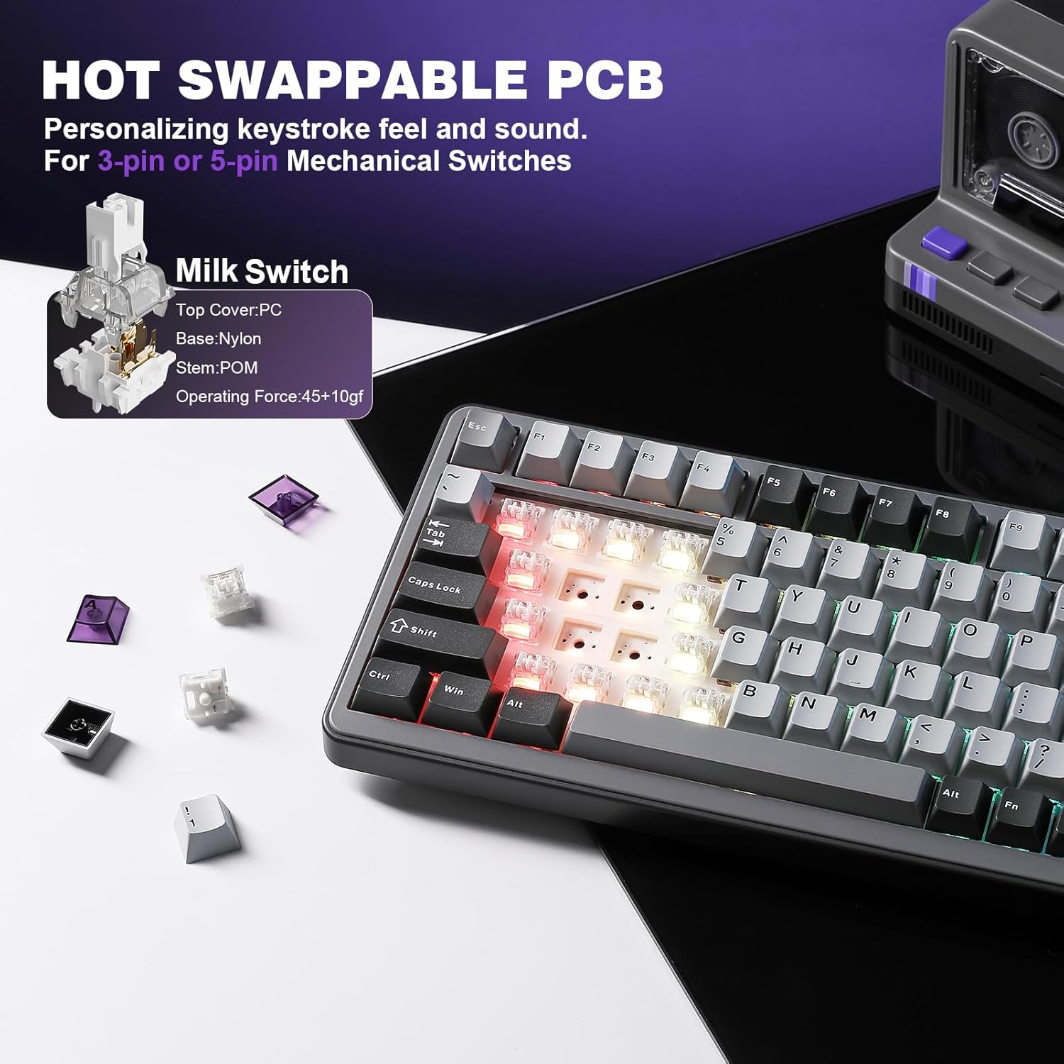 YUNZII B75 PRO Безжична механична клавиатура, 75% уплътнение за геймърска клавиатура, възможност за бърза замяна, персонализирана клавиатура с бутони, предварително смазани RGB превключватели, трирежимна клавиатура (тъмносива, млечен превключвател)