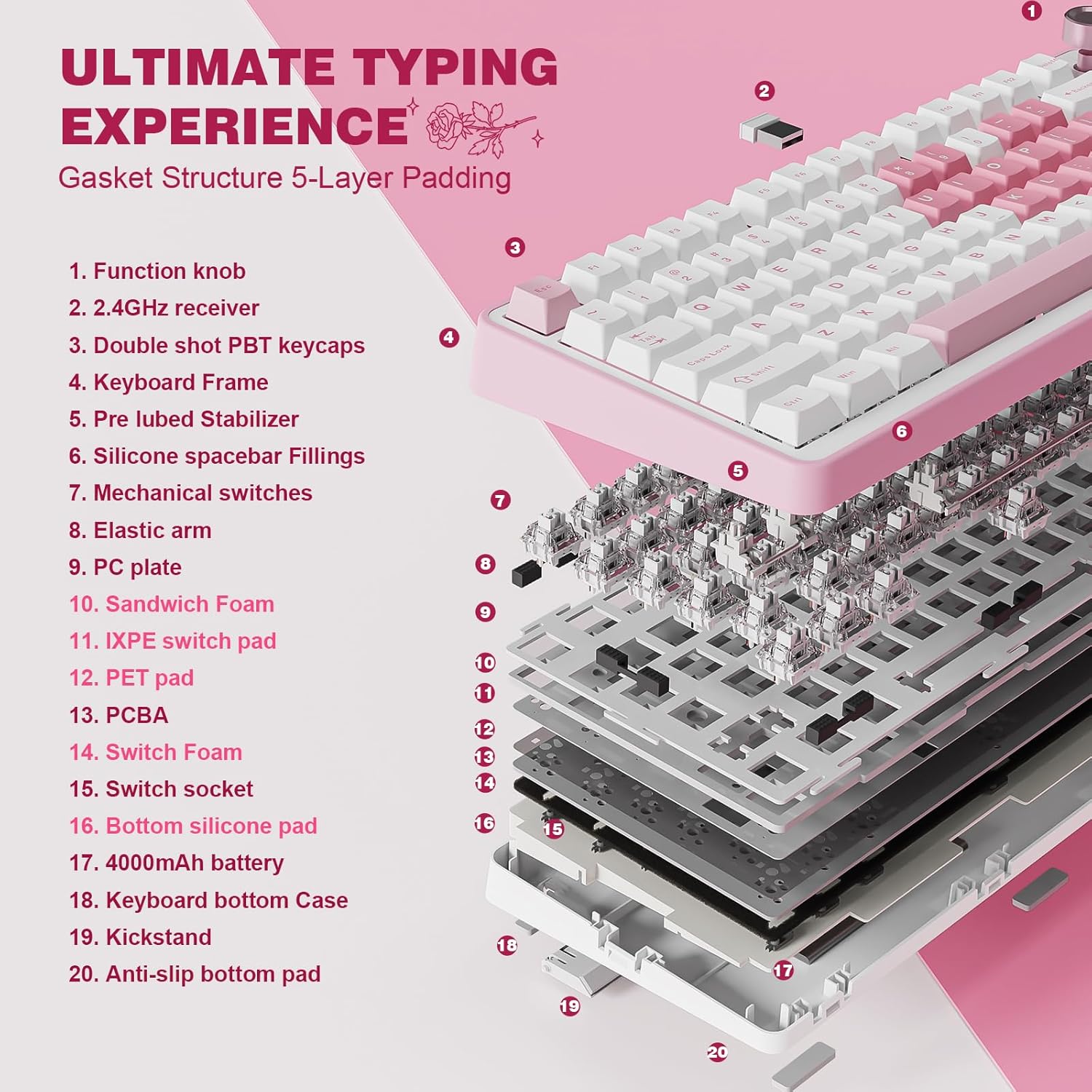 • Уплътнителна клавиатура Кремообразната клавиатура е проектирана с най-модерната уплътнителна структура. С 5-слойна подплата, дизайн за шумопотискане, клавиши с двойно покритие, прецизно настроени стабилизатори и предварително смазани механични превключватели, тази линейна клавиатура предлага почти кремообразно звучене и солидно усещане при писане.