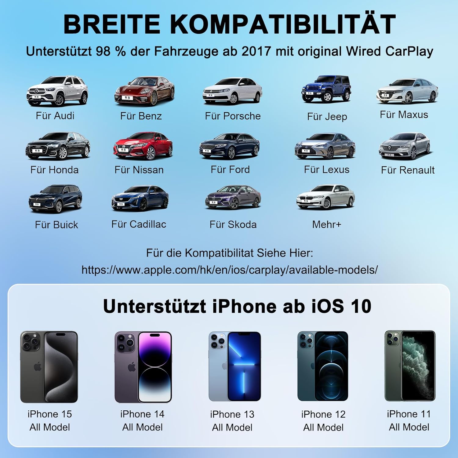 • 【Универсална съвместимост】Безжичният адаптер CarPlay е съвместим с автомобили, оборудвани с кабелен CarPlay, и поддържа iPhone с iOS 10 и по-нова версия. Съвместим е само с оригиналната кабелна система CarPlay. (Моля, уверете се, че колата ви поддържа CarPlay, преди да закупите.)
