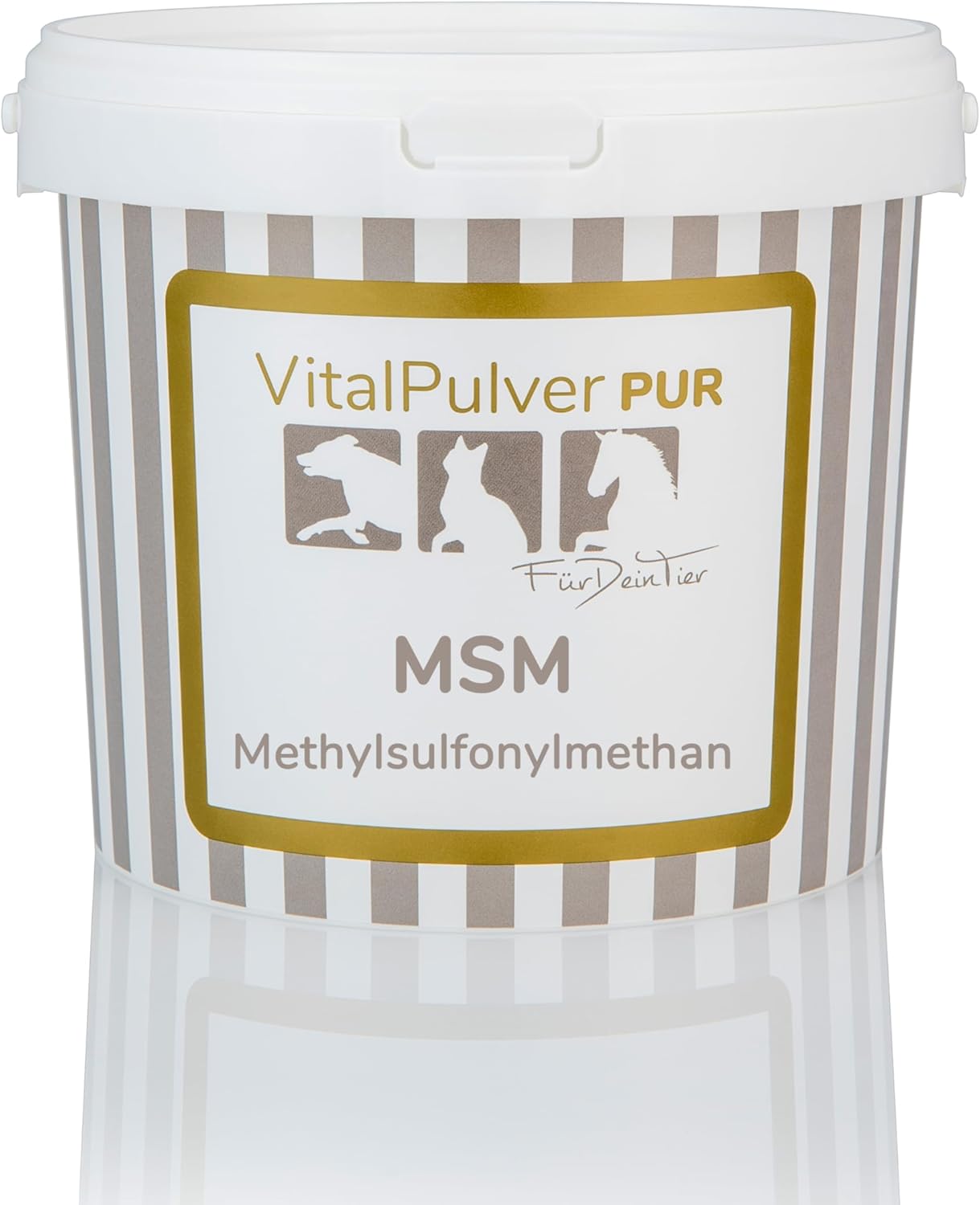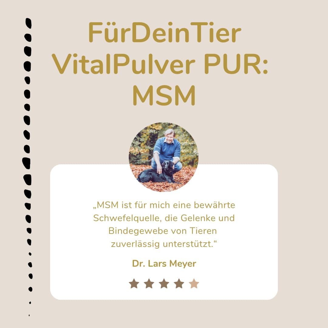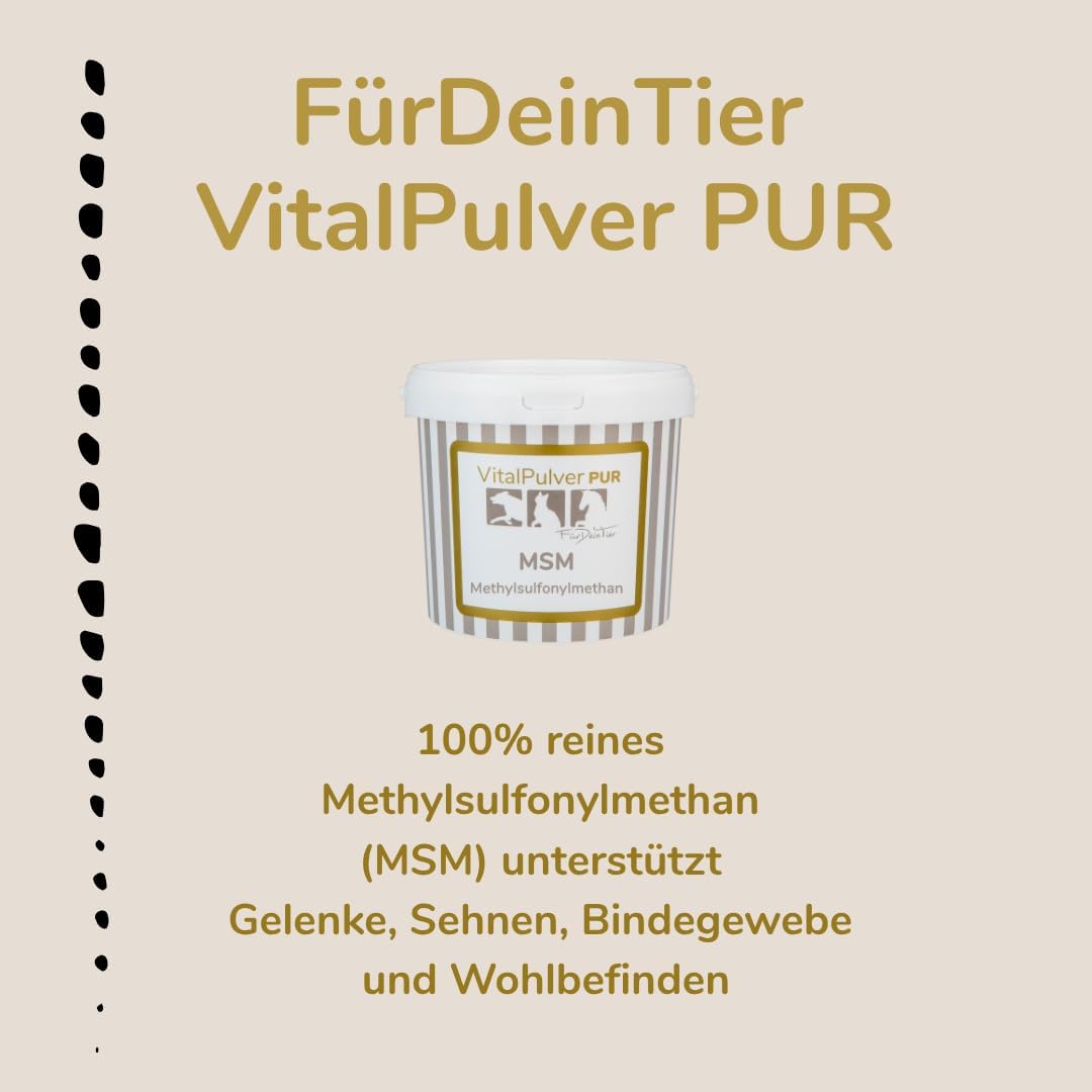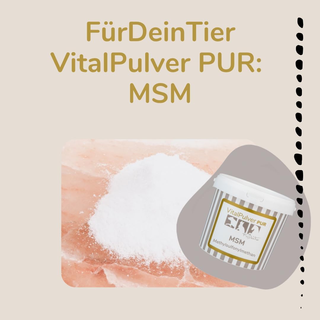 MSM Vital прах за кучета, котки и коне. Нашият MSM Vital прах се състои от 100% чист метилсулфонилметан (MSM) – висококачествен органичен източник на сяра за кучета, котки и коне. Сярата е основен компонент на аминокиселините, ензимите и тъканите и играе ключова роля за еластичността на съединителната тъкан, функцията на ставите и здравето на кожата и козината. Специални свойства: 100% чист метилсулфонилметан – без добавки и освобождаващи агенти. Фин, лесно разтворим прах – просто се смесва с храната. Естествен източник на сяра за ежедневния метаболизъм. Подпомага ставите, съединителната тъкан, кожата и козината. Ползи с един поглед: Чист MSM – висококачествен източник на сяра без добавки Подпомага ставите, хрущялите и съединителната тъкан Допринася за здравето на кожата, козината и опорно-двигателния апарат Подходящ за кучета, котки и коне – включително спортни и работни животни Лесно и дългосрочно приложение, може да се комбинира и с глюкозамин или хондроитин. Указания: MSM Vital прахът се смесва директно с ежедневната храна. Препоръчва се дългосрочно приложение, за да се използват оптимално хранителните ползи. Препоръка за хранене (в зависимост от телесното тегло): Куче: приблизително 50–100 мг на кг телесно тегло (напр. 1 г за куче с тегло 10–15 кг) Котка: приблизително 100–200 мг на ден Кон: 5–10 г на ден (в зависимост от размера и натоварването) Винаги трябва да има на разположение прясна вода. Забележка: Еднократно хранене за животни. Без терапевтични твърдения, не е лекарство.