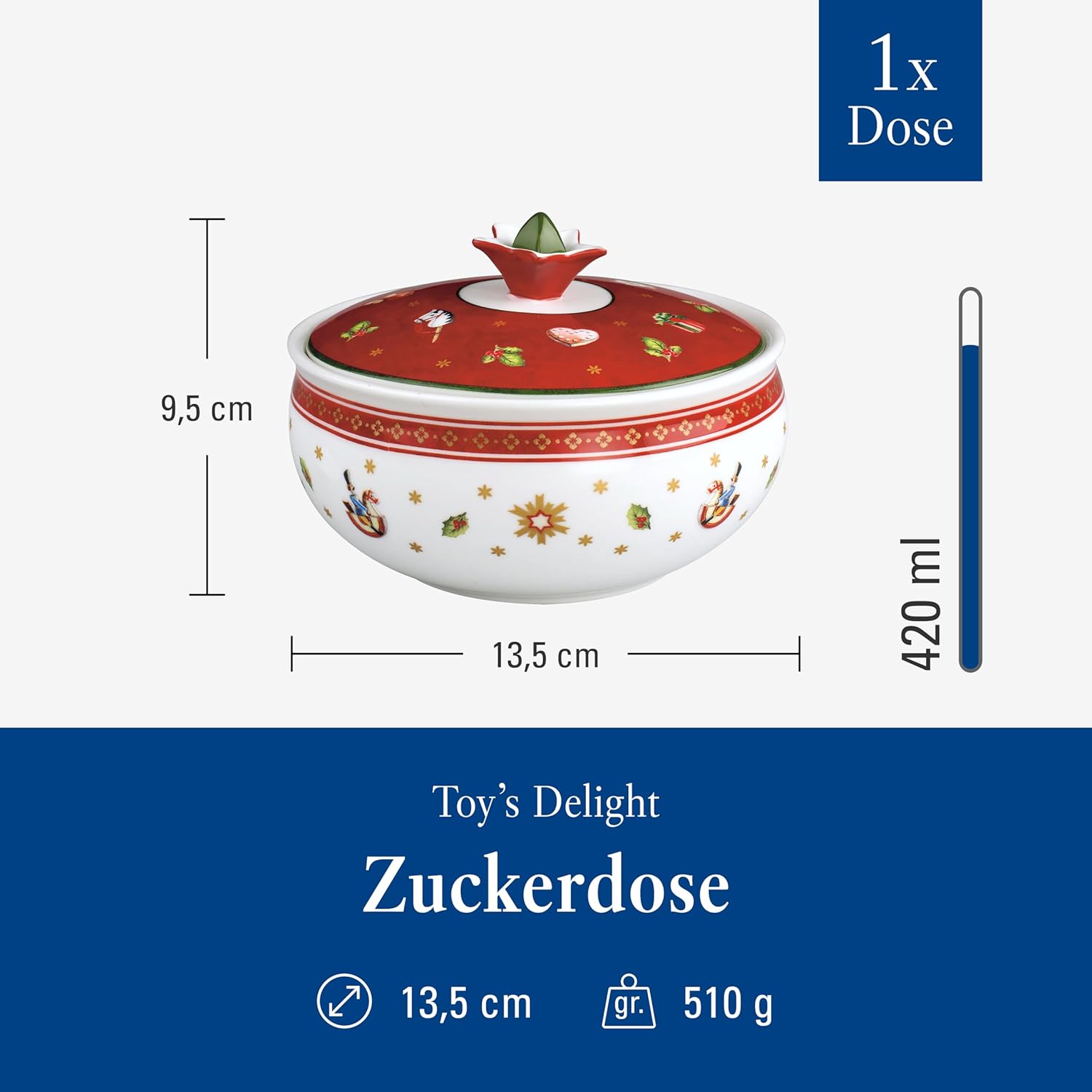 Освен носталгичните си мотиви, колекцията Toy's Delight впечатлява с празнични цветове в сияйно бяло, наситено зелено и наситено червено. Идеална за комбиниране, колекциониране или подаряване. Създавайте свеж вид за вашата коледна трапеза всеки път.