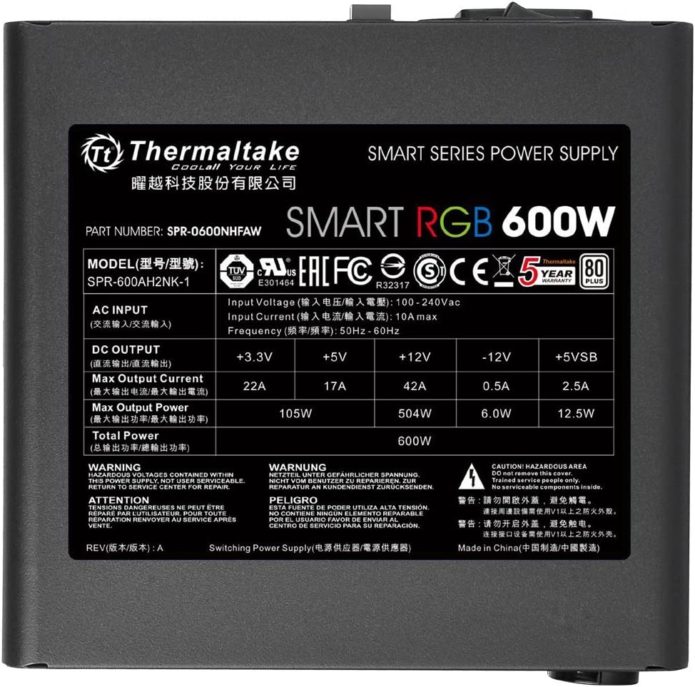 Захранващ блок Thermaltake Smart 600W, 80 plus, 120мм вентилатор До 1800 rpm, RGB Подсветка