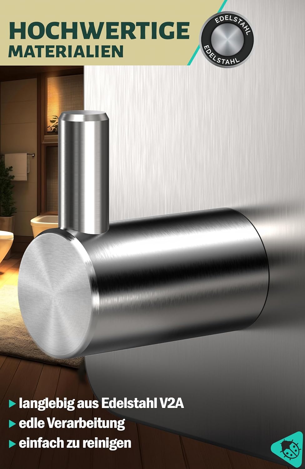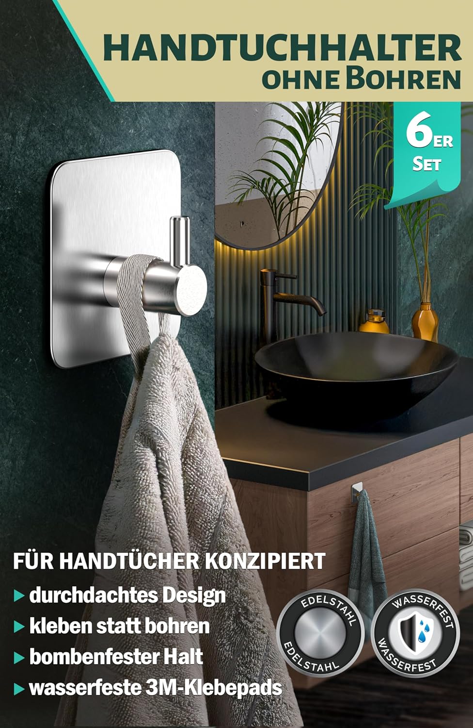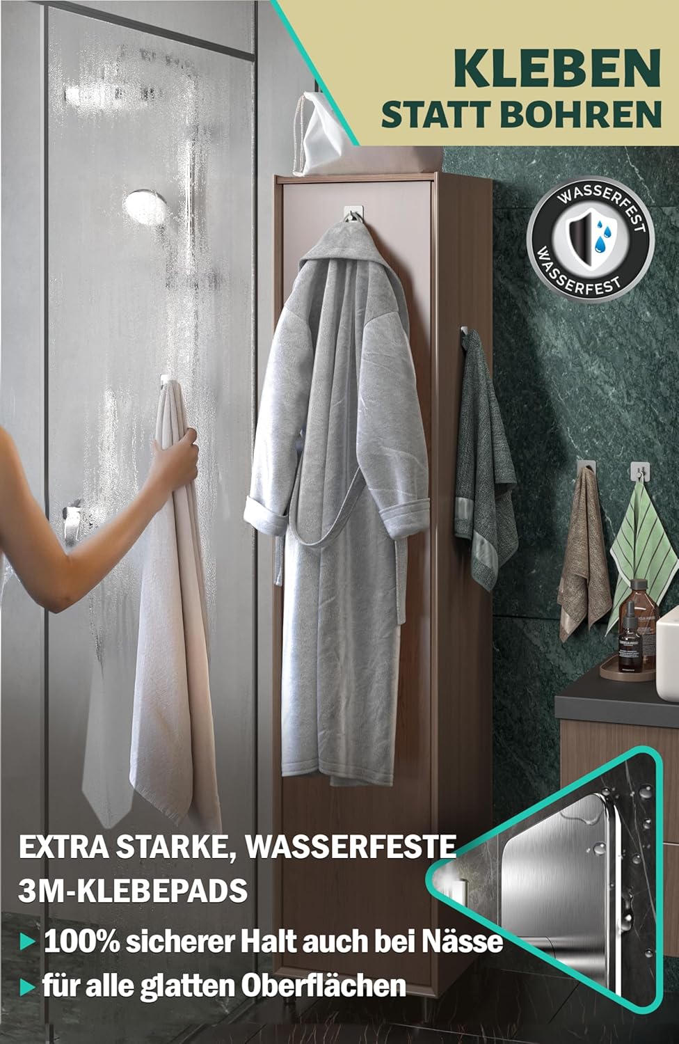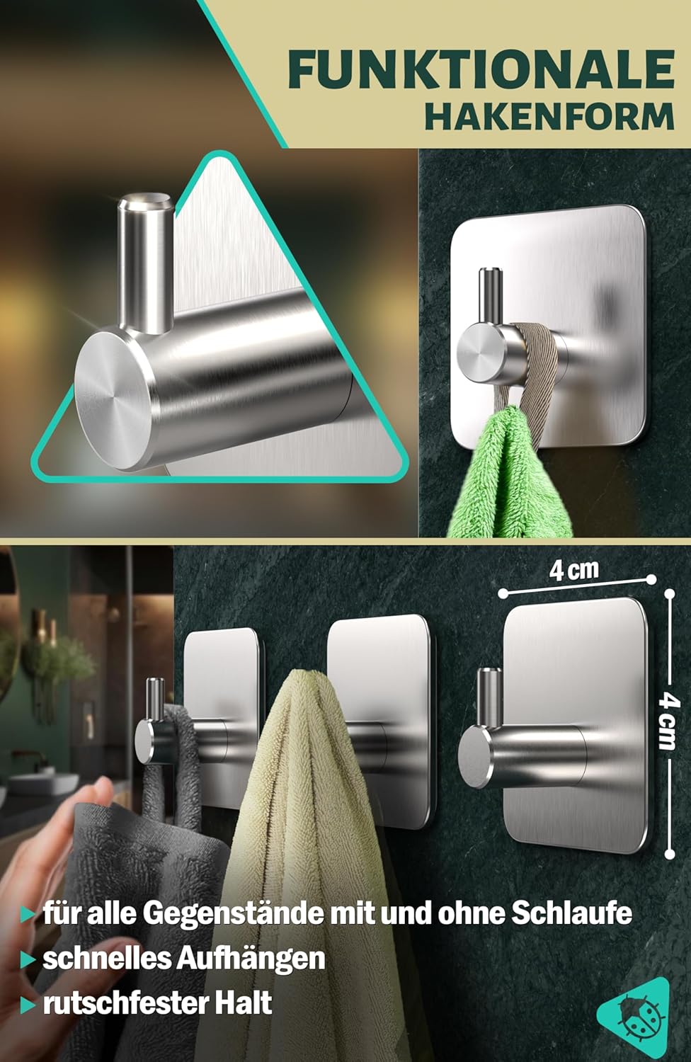 • Висококачествени материали: издръжливи самозалепващи се куки за кърпи, изработени от неръждаема стомана V2A и висококачествена изработка, осигуряват двойна защита от ръжда; лесни за почистване; идеални като аксесоар за баня