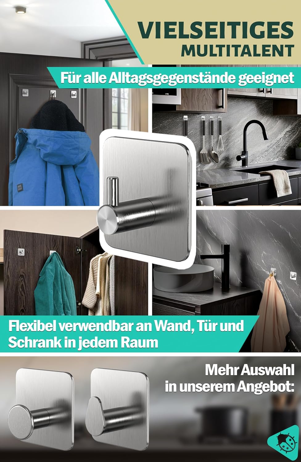 • Многофункционални: 6 самозалепващи се куки от неръждаема стомана, идеални за закачане на палта, кухненски държачи за кърпи, както и закачане на кърпи без пробиване на врати, шкафове във всички стаи - наистина задължителни за първия апартамент