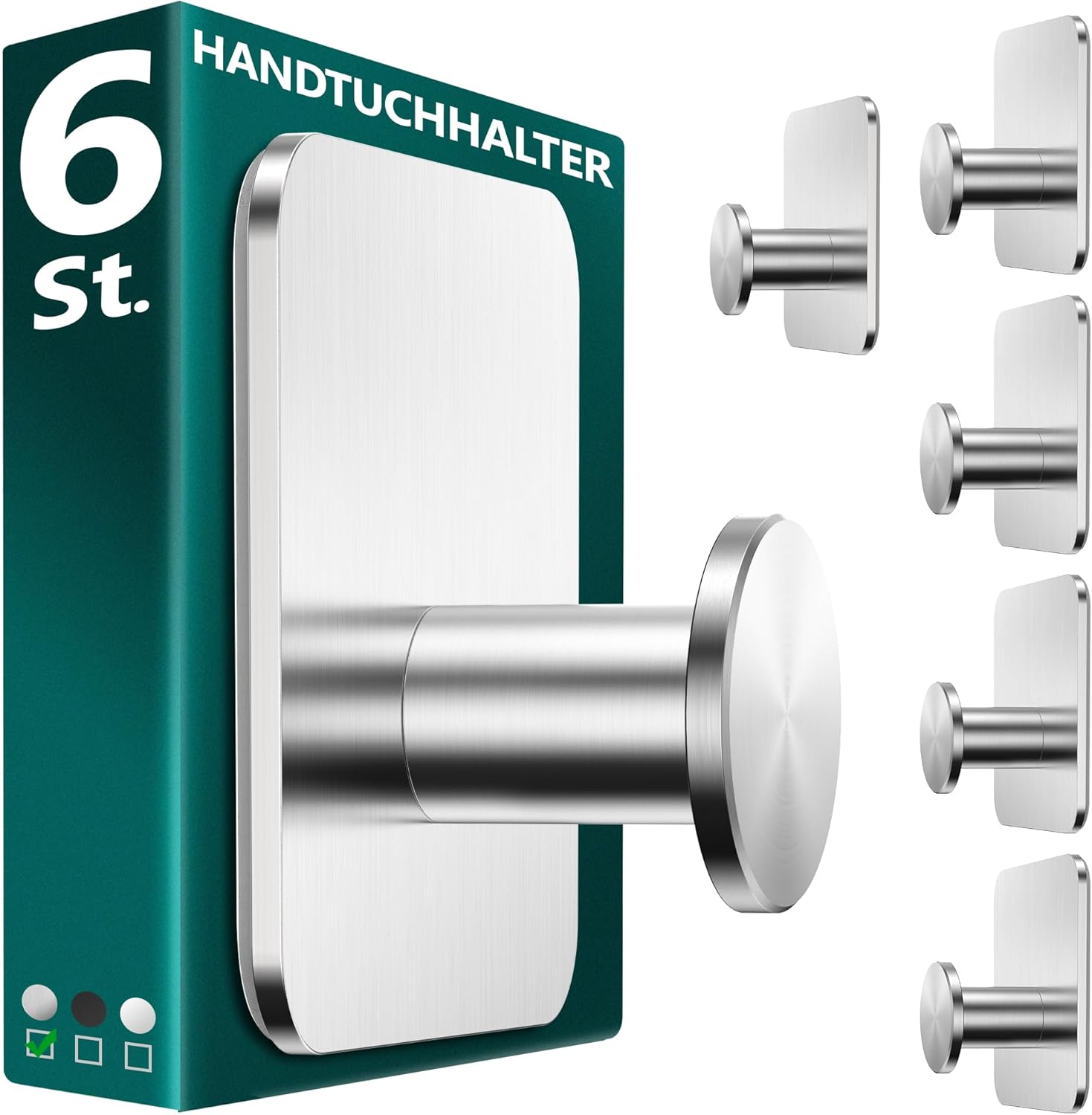 • Елегантни самозалепващи се стенни куки в комплект от 6: висококачествени държачи за кърпи без пробиване от неръждаема стомана с водоустойчиви лепящи подложки осигуряват трайно и здраво закрепване в банята, тоалетната и кухнята.