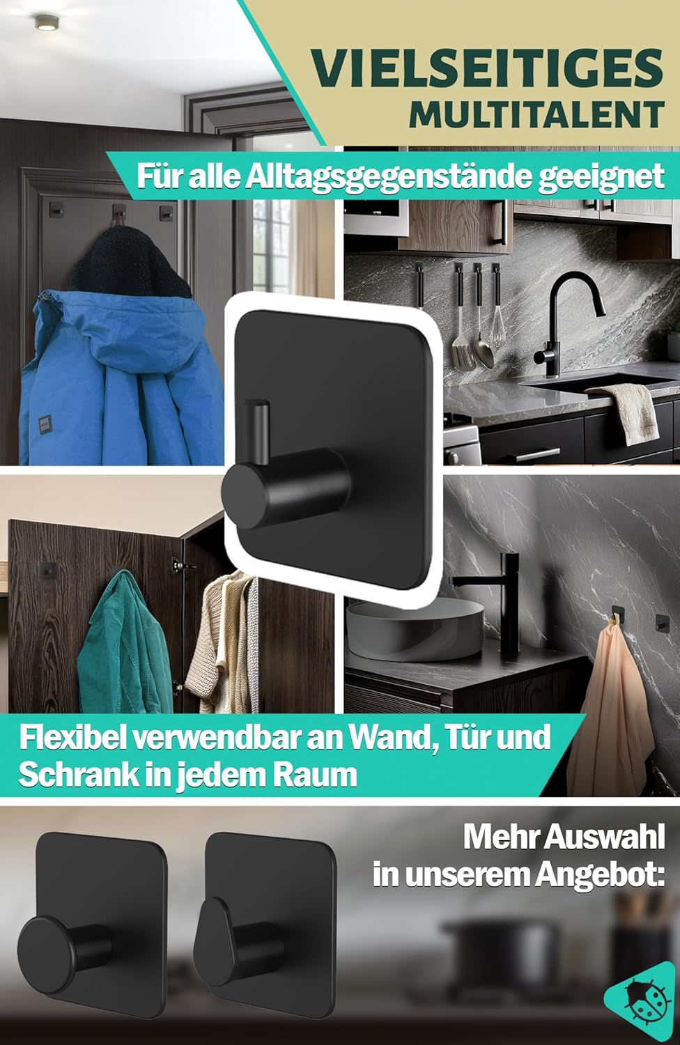 • Многофункционални: 6 самозалепващи се куки от неръждаема стомана, идеални за закачане на палта, кухненски държачи за кърпи, както и закачане на кърпи без пробиване на врати, шкафове във всички стаи - наистина задължителни за първия апартамент