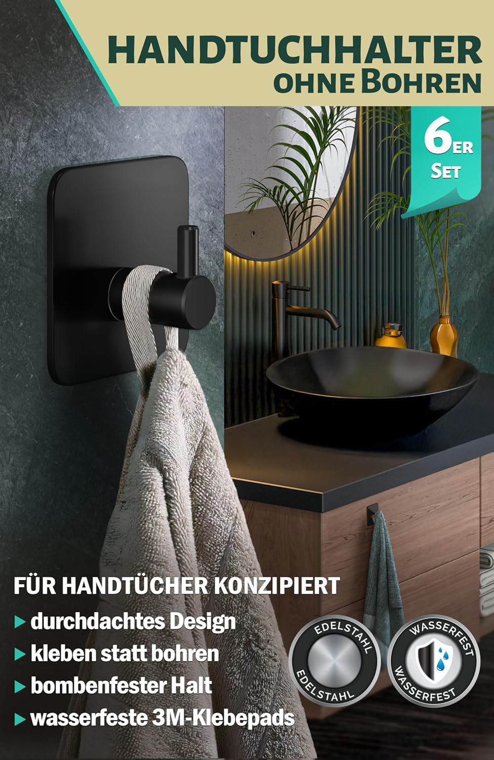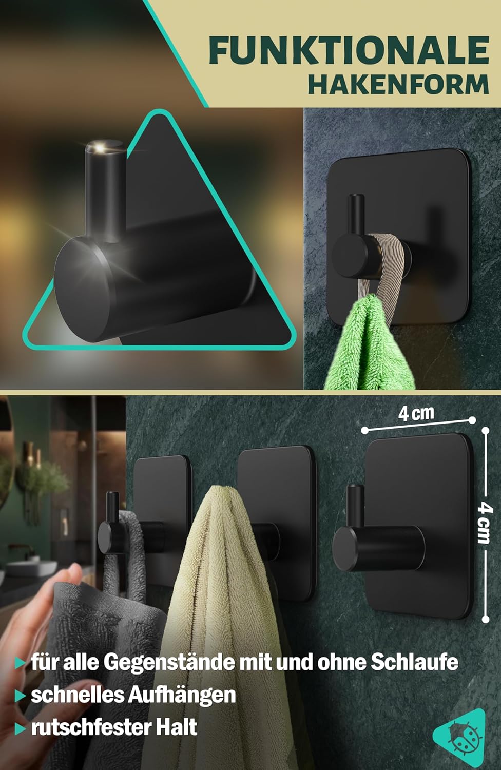 Закачалка за кърпи Menz, без пробиване, 6 броя, черна, от неръждаема стомана, водоустойчиви, самозалепващи се куки, издръжливи куки за баня, самозалепващи се куки, идеални като функционални куки за кърпи