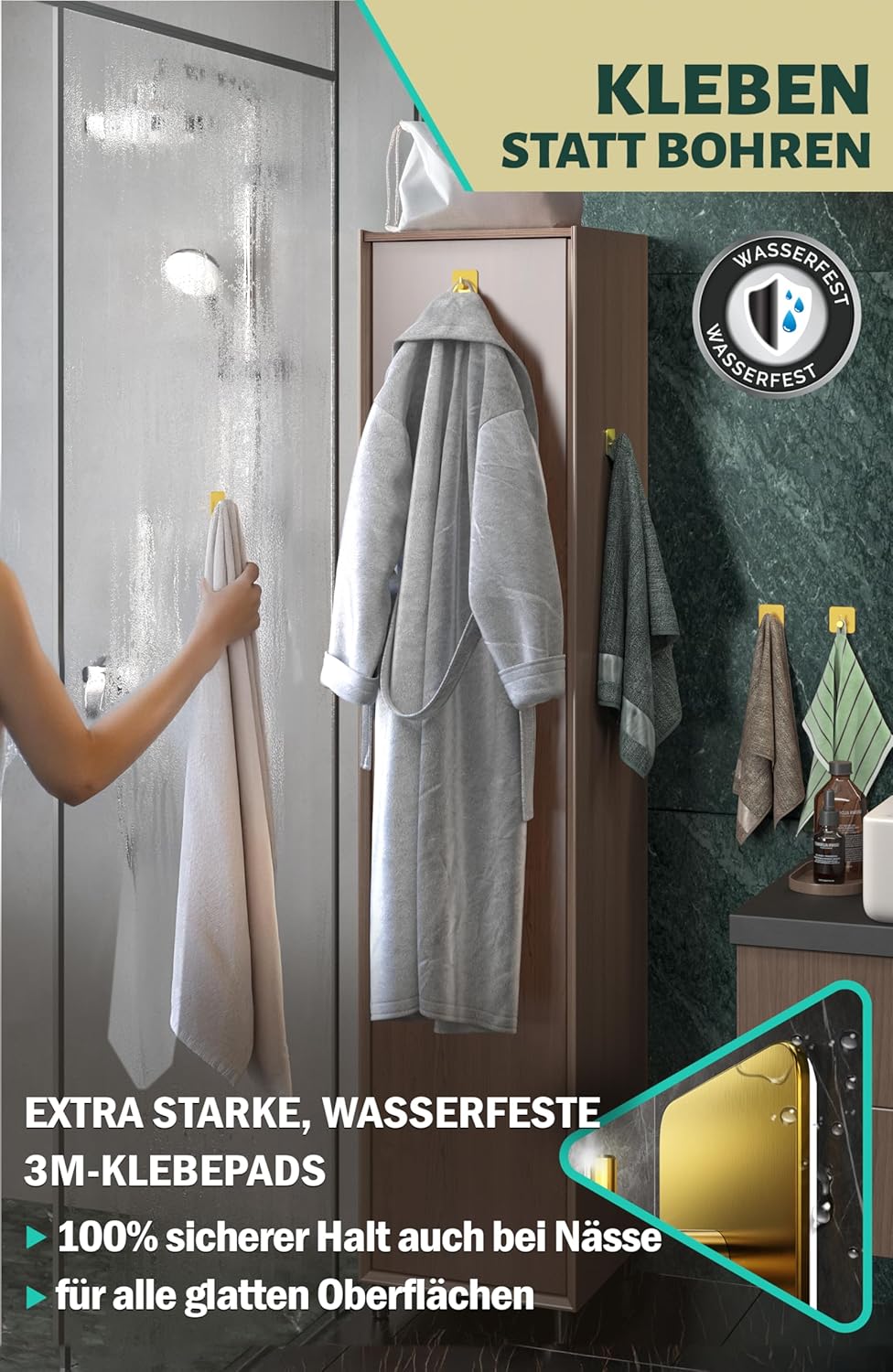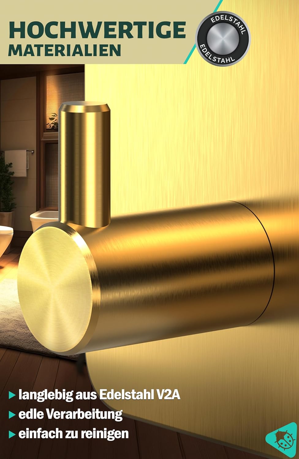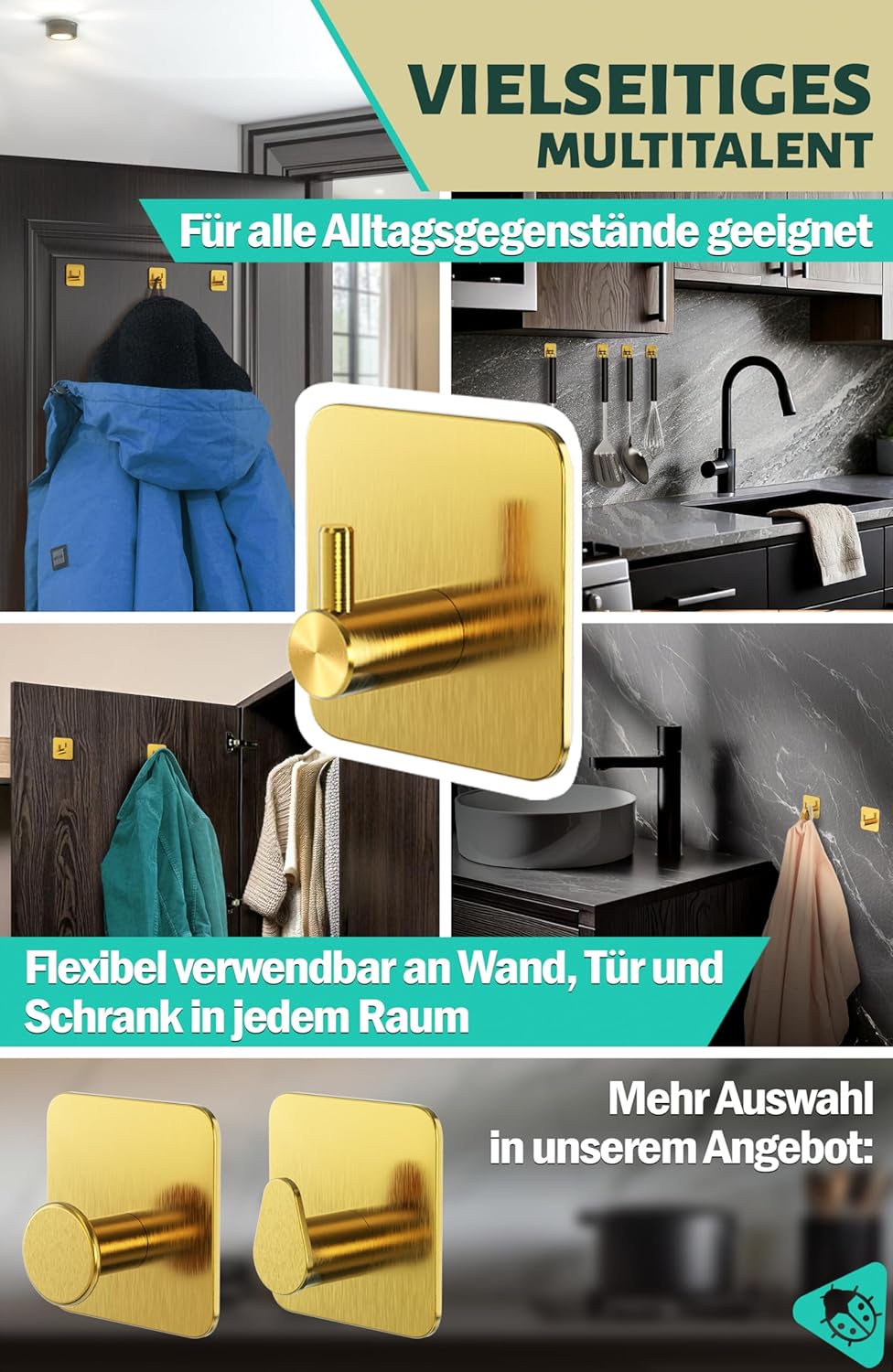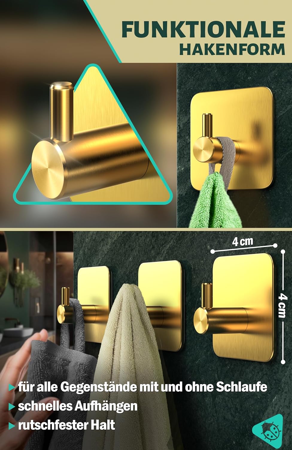 Закачалка за кърпи Menz, без пробиване, 6 броя, златна, от неръждаема стомана, водоустойчиви, самозалепващи се куки, издръжливи куки за баня, самозалепващи се куки, идеални като функционални куки за кърпи