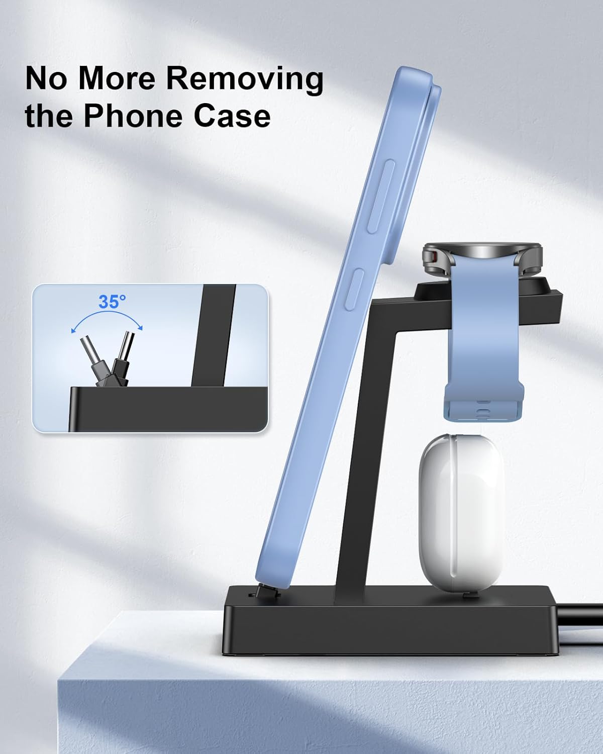 • Подходящ за истински калъфи за телефон: не е нужно да сваляте красивия си калъф преди зареждане! Поставката за зареждане на телефон ви спестява неудобството от свалянето на калъфите всеки път за зареждане. Светлинната глава е регулируема, така че можете да зареждате телефона си с калъфи, чиято дебелина може да достигне до 11 мм. В допълнение към обикновените калъфи, тя е подходяща и за магнитни калъфи и калъфи за кредитни карти.