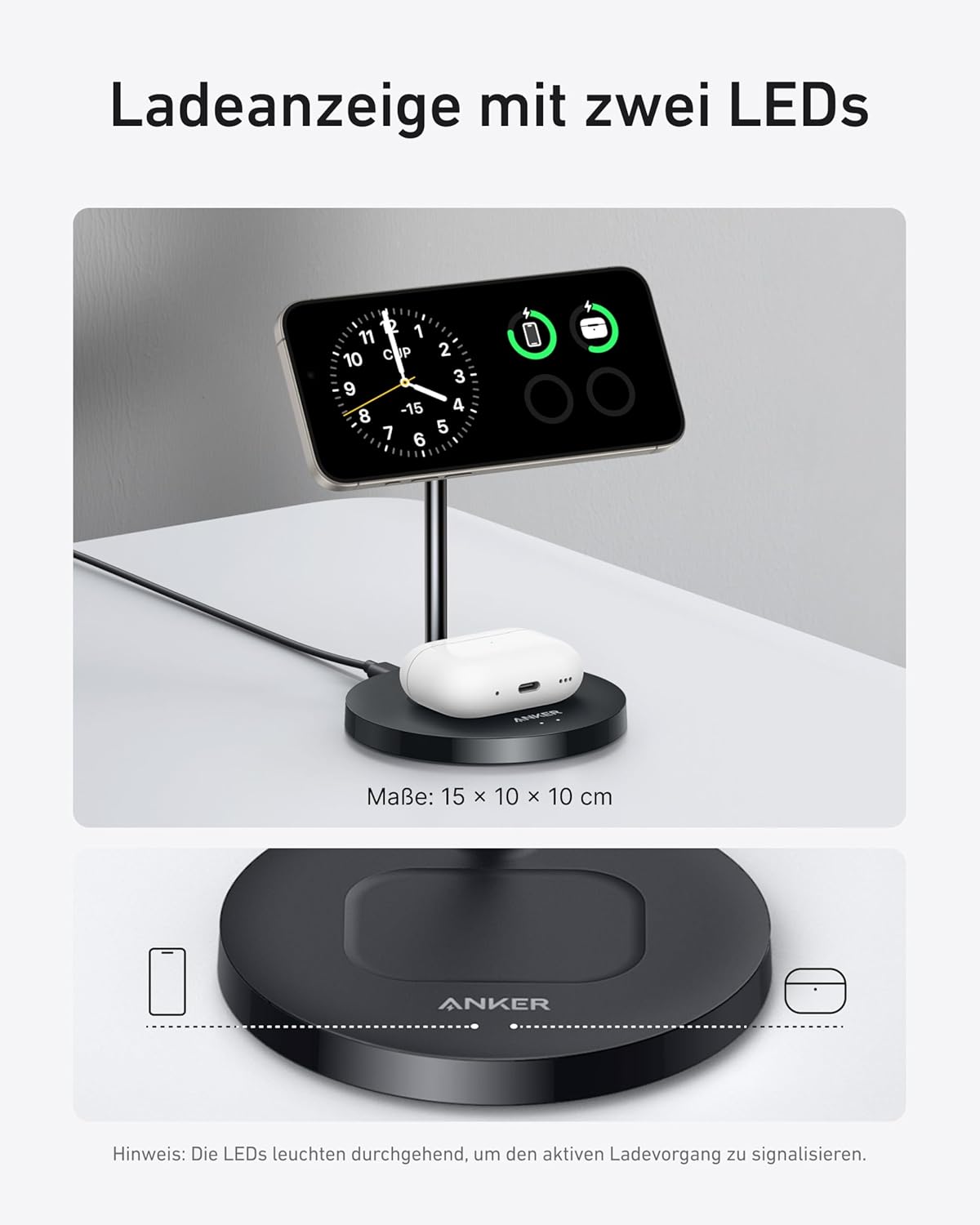Зарядно Anker MagGo 15W, съвместимо с Magsafe, 2-в-1 индуктивна зарядна станция, безжично Qi2 зарядно за iPhone 17/16/15/14/13/12, AirPods Pro, с 1.5 м USB C кабел, без захранване