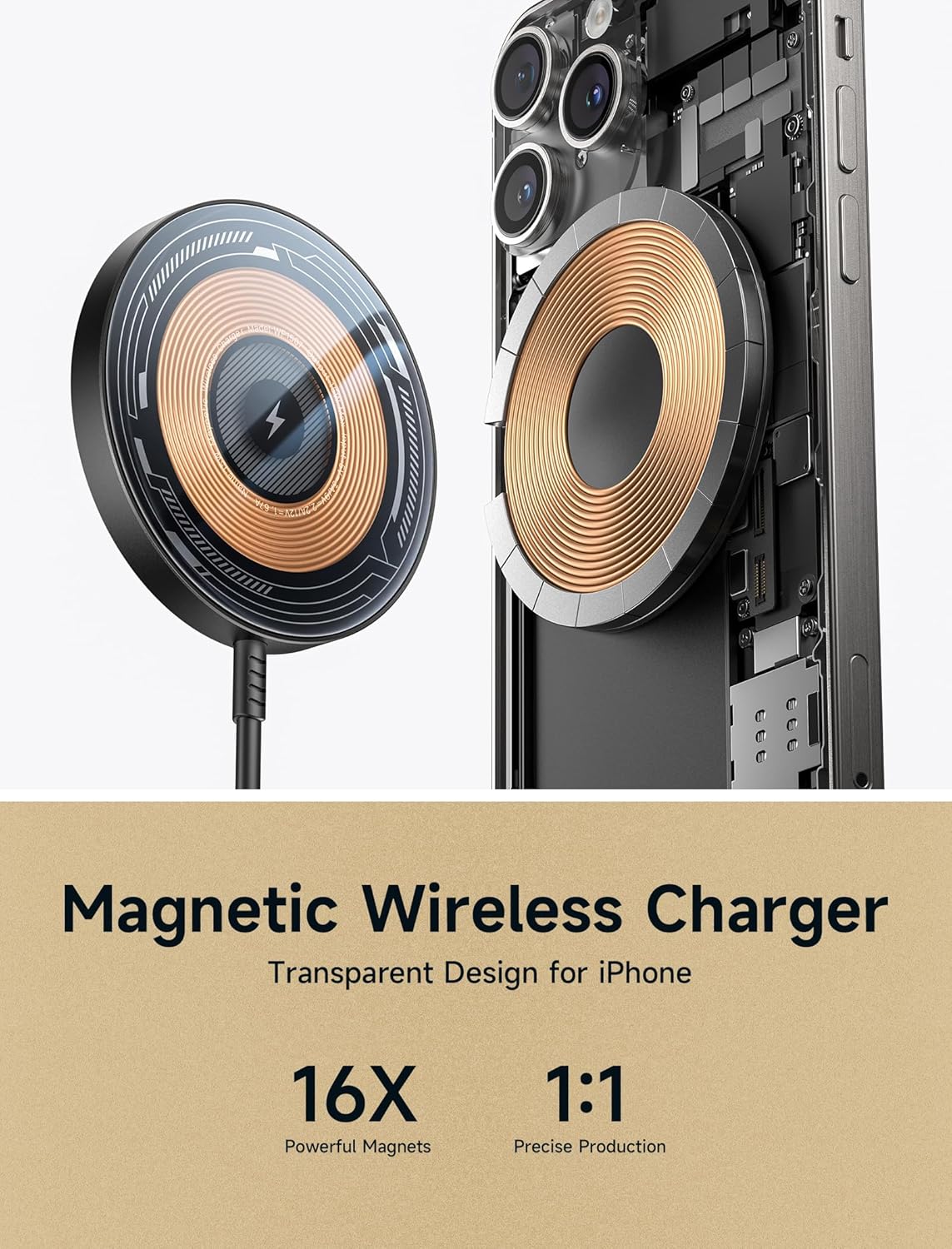 Зарядно Mag-Safe 15 W, JSAUX безжично зарядно, индуктивна станция за зареждане, съвместима с MagSafe Charger за iPhone 17 Air Pro Max/iPhone 16/15/14 13 12 Series, AirPods 3/2, безжично зарядно, прозрачно