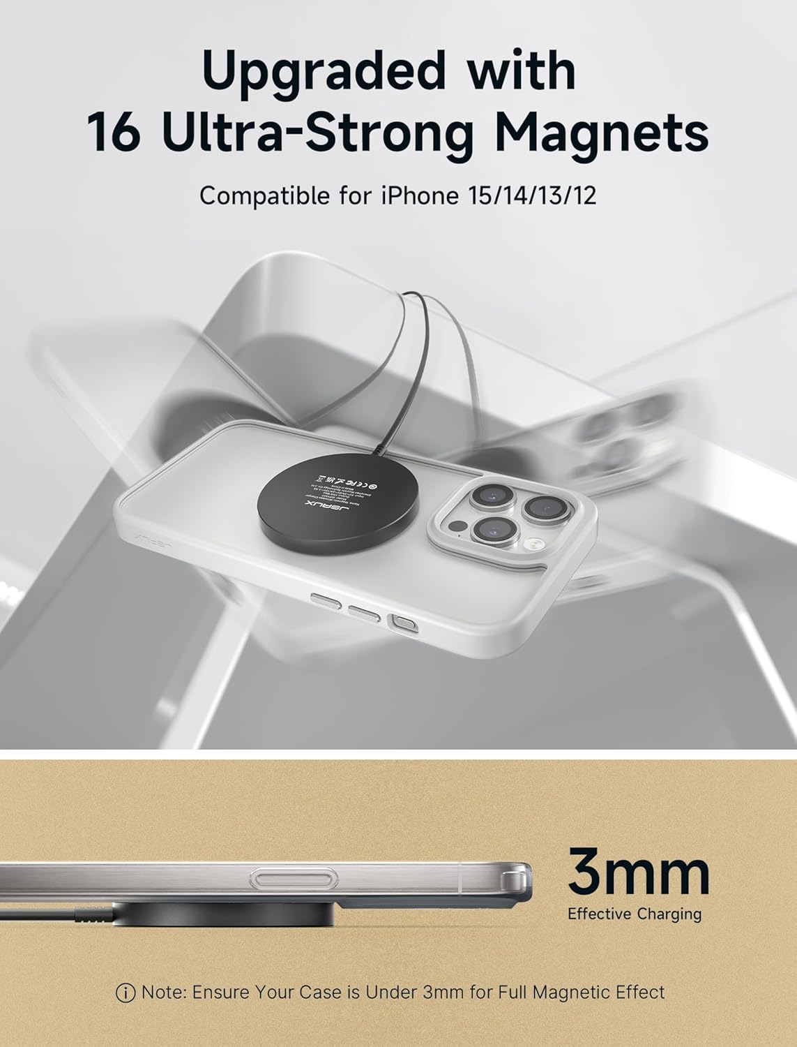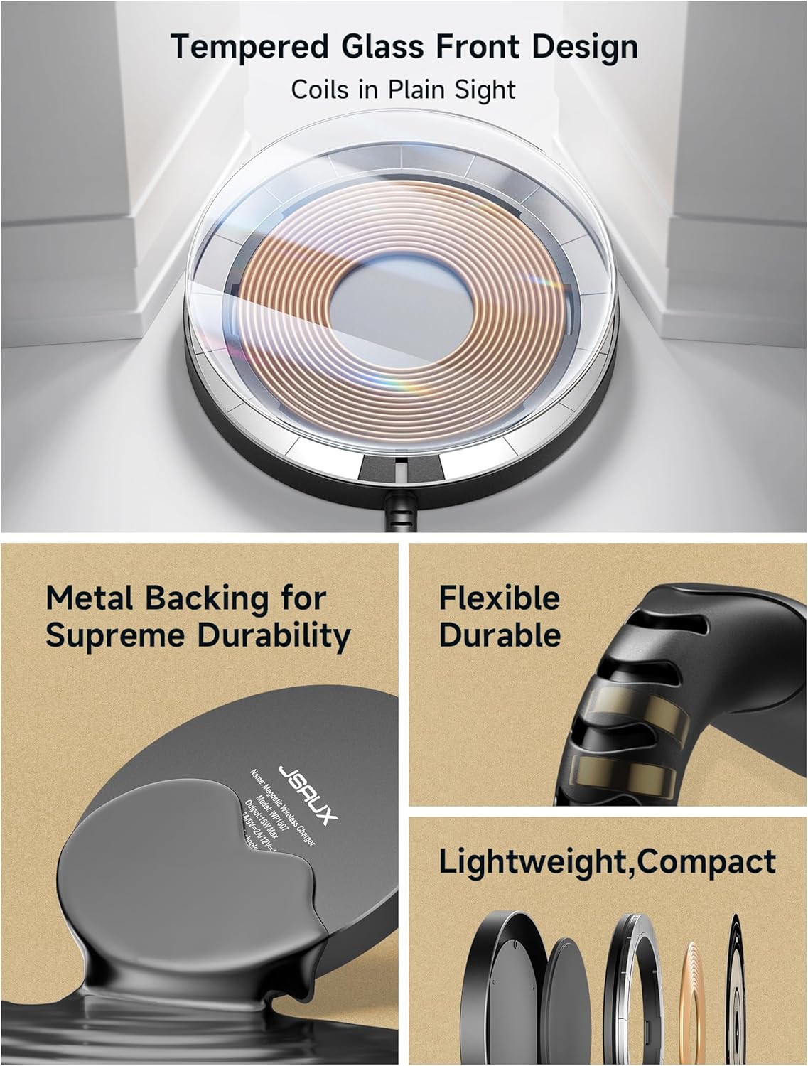 • Съвместимо с iPhone 17/16/15/14/13/12: Магнитното безжично зарядно устройство JSAUX осигурява бързо и ефикасно безжично зареждане на вашите устройства. То поддържа зареждане и на AirPods 3, AirPods 2, AirPods Pro и официални Mag-Safe калъфи. Не е съвместимо с калъфи за телефони, които не са MagSafe.