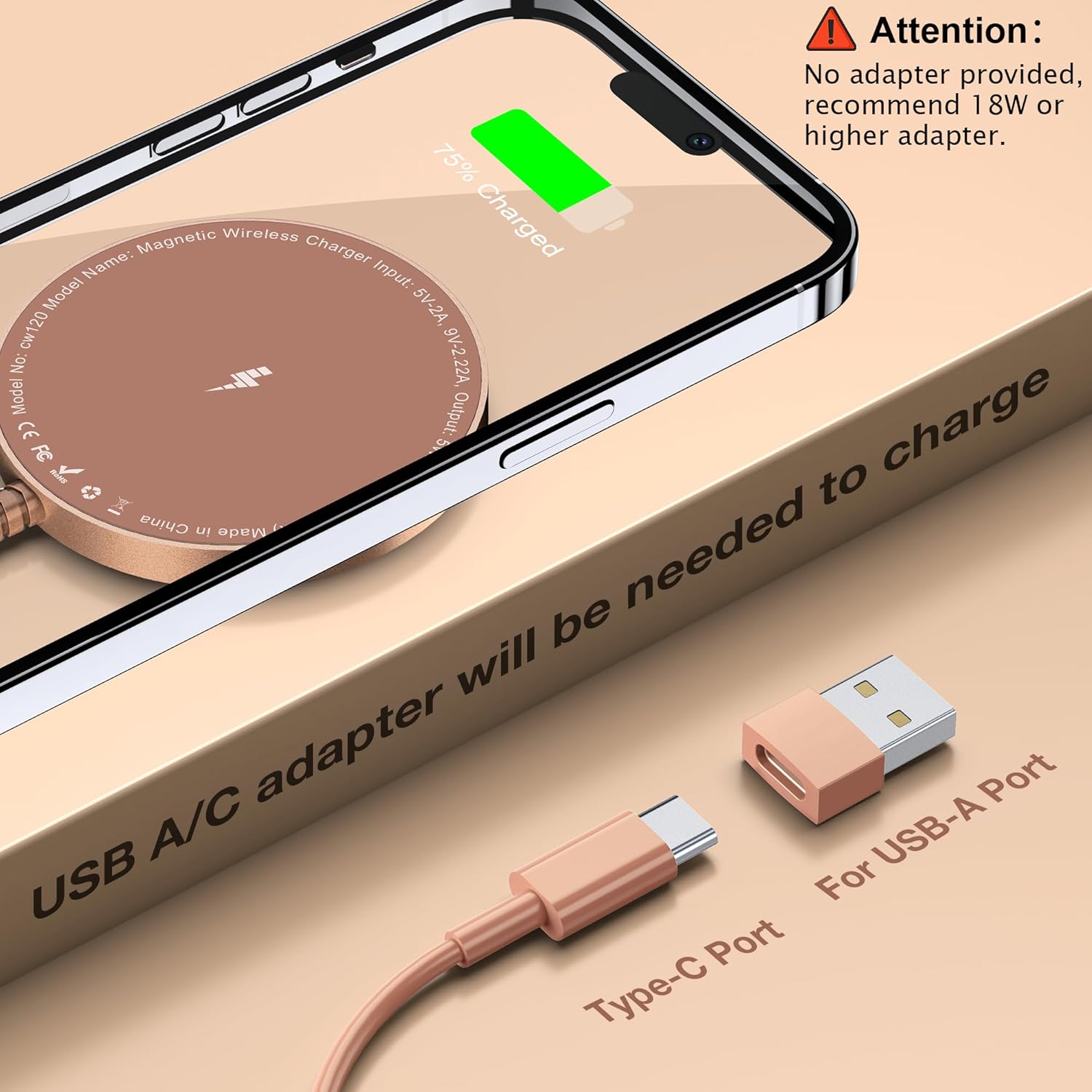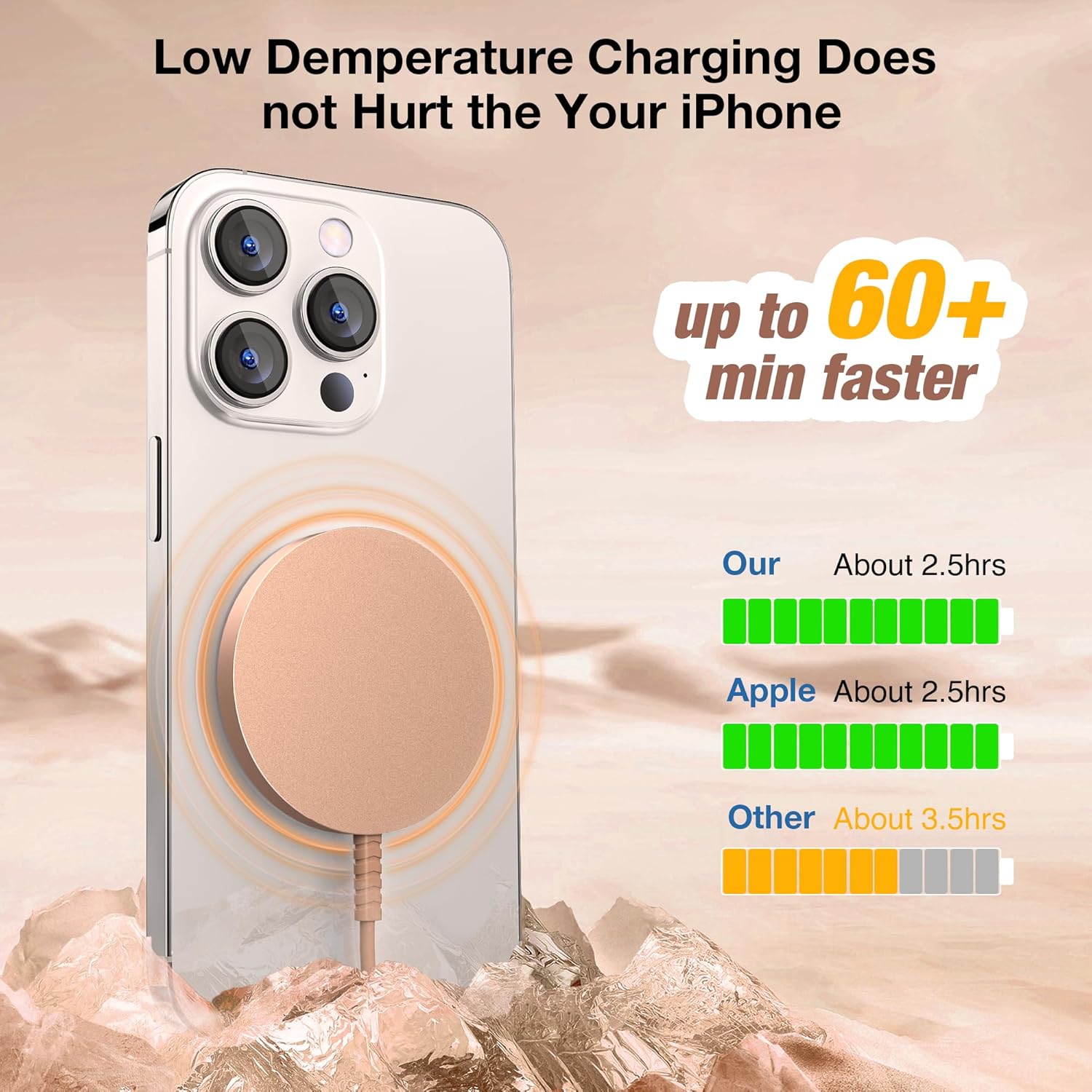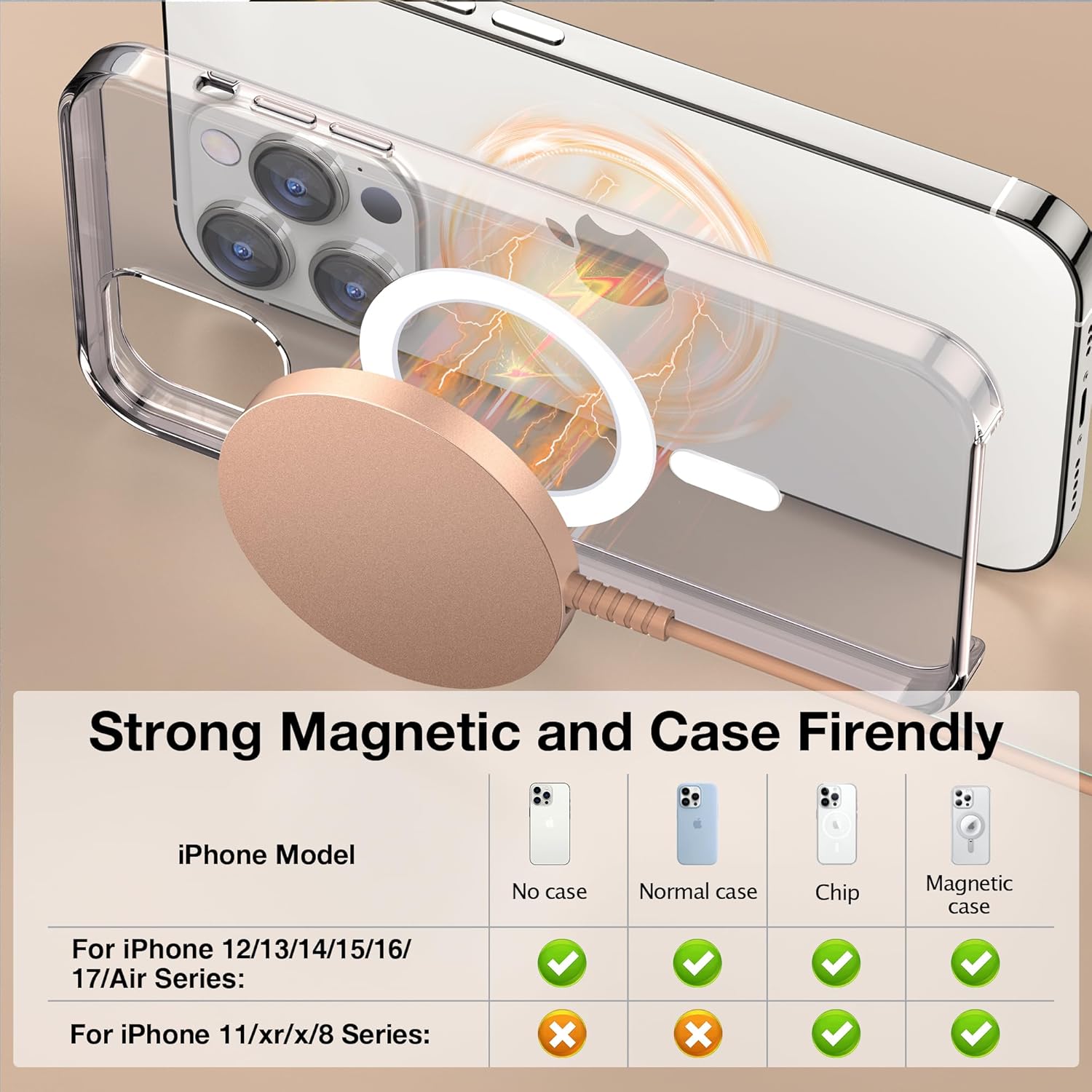 • Специално проектирано за iPhone 17 16 15 14 13 12: Това Mag-Safe зарядно устройство е съвместимо с iPhone 17 16 15 14 13 12, iPhone 17 16 15 14 13 12 Pro, iPhone 17 16 15 14 13 12 Pro Max, iPhone Air, iPhone 16 15 14 Plus, iPhone 12 13 Mini и Air Pods 3 2 Pro, както и с модели с магнитни калъфи за iPhone 8 и по-нови модели, които също могат да се зареждат магнитно. (Забележка: Не се препоръчва за други марки, тъй като разположението на магнитите им може да варира и е възможно да има грешки при зареждане.)