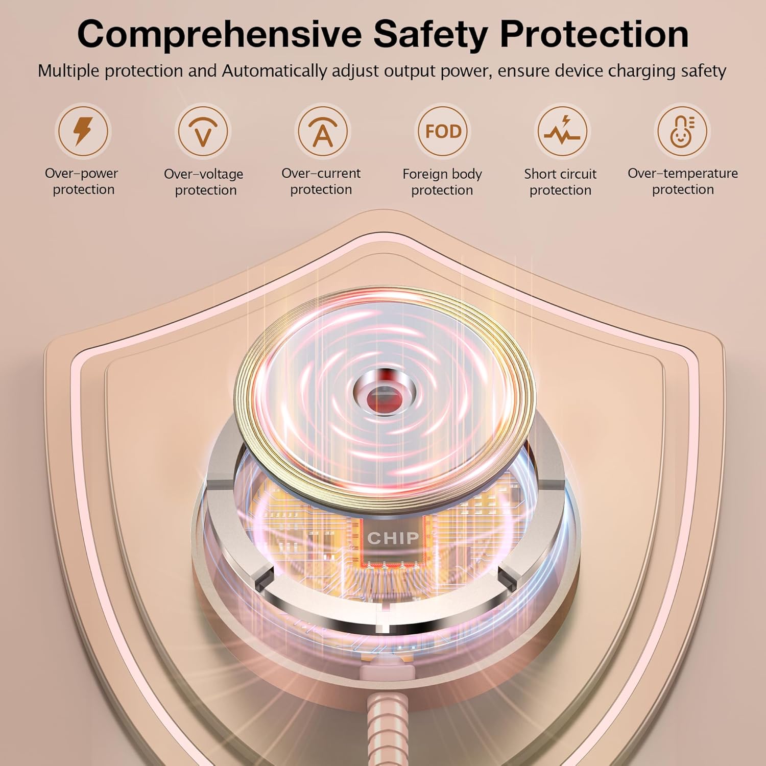 • Безопасна интелигентна защита: нашата магнитна станция за зареждане на iPhone е изработена от корпус от алуминиева сплав с по-добра система за разсейване на топлината, вграден чип за управление на зареждането с множество защитни функции, като например претоварване по ток, пренапрежение, прегряване, късо съединение и др., което предпазва устройството ви от повреди от презареждане и ви осигурява най-безопасната среда за зареждане.