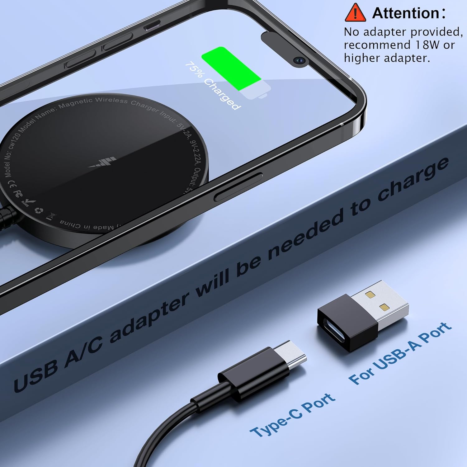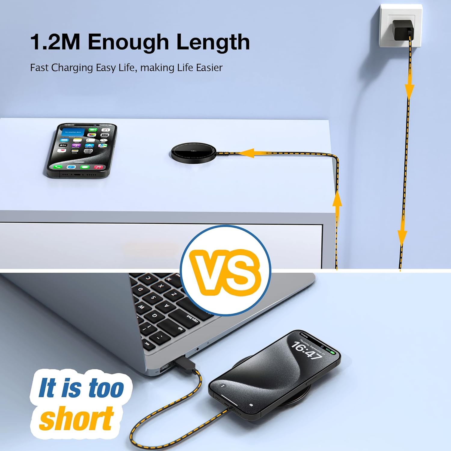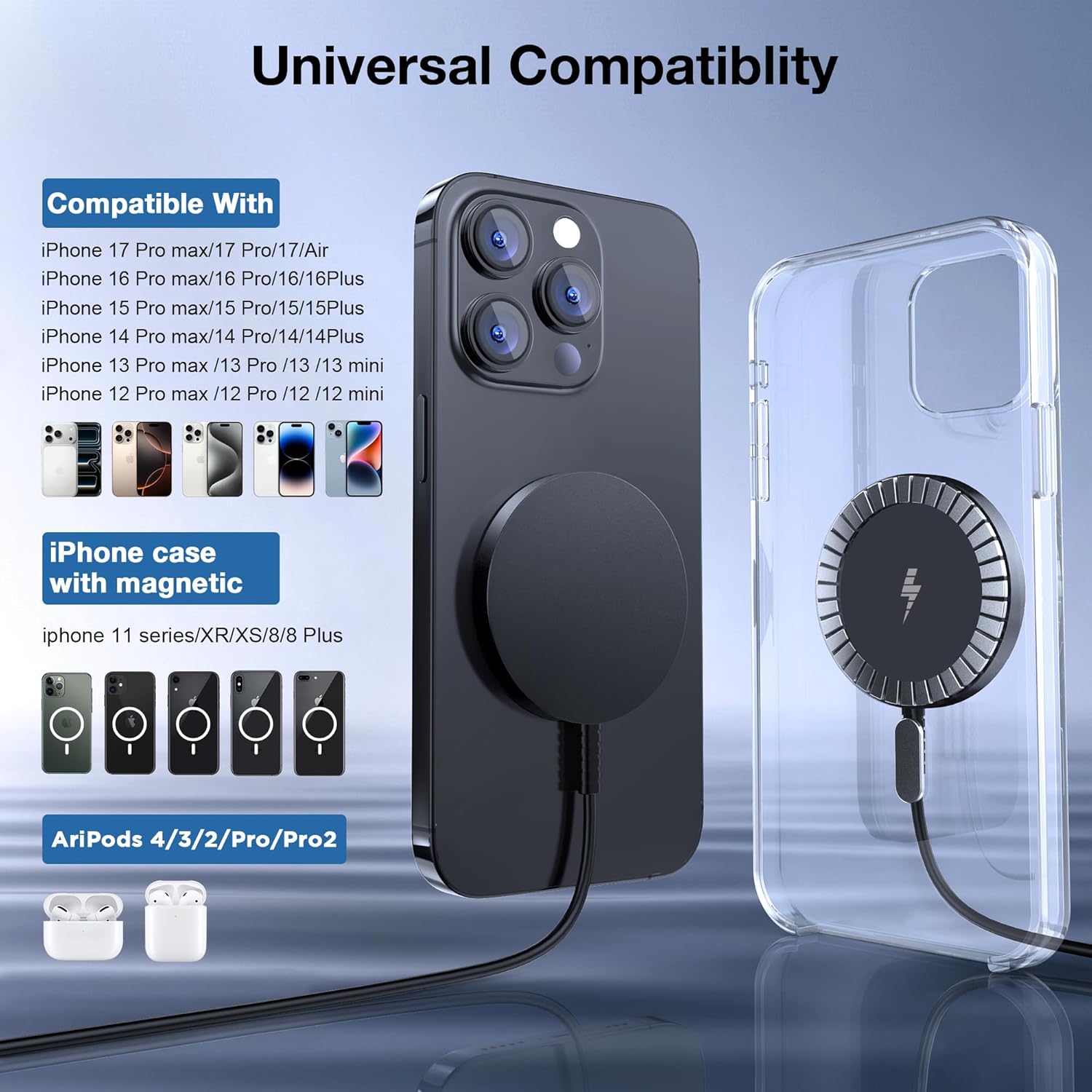 • Специално проектирано за iPhone 17 16 15 14 13 12: Това Mag-Safe зарядно устройство е съвместимо с iPhone 17 16 15 14 13 12, iPhone 17 16 15 14 13 12 Pro, iPhone 17 16 15 14 13 12 Pro Max, iPhone Air, iPhone 16 15 14 Plus, iPhone 12 13 Mini и Air Pods 3 2 Pro, както и с модели с магнитни калъфи за iPhone 8 и по-нови модели, които също могат да се зареждат магнитно. (Забележка: Не се препоръчва за други марки, тъй като разположението на магнитите им може да варира и е възможно да има грешки при зареждане.)