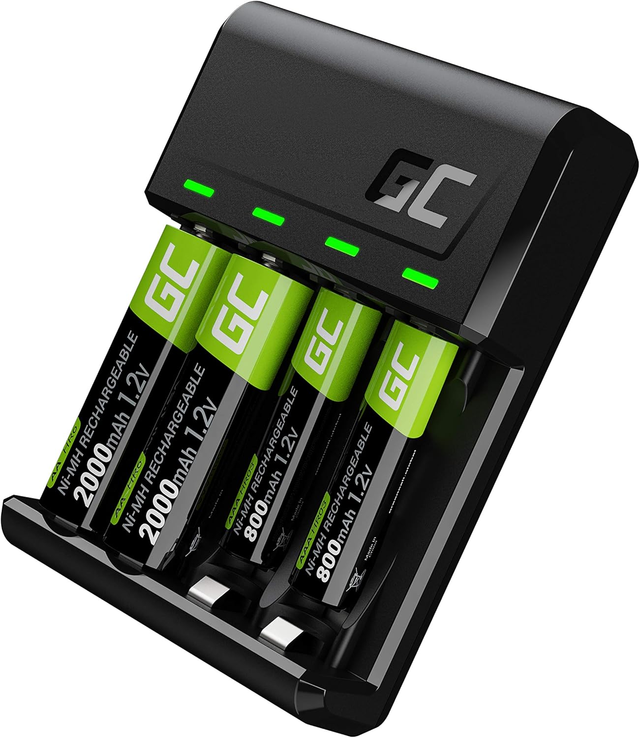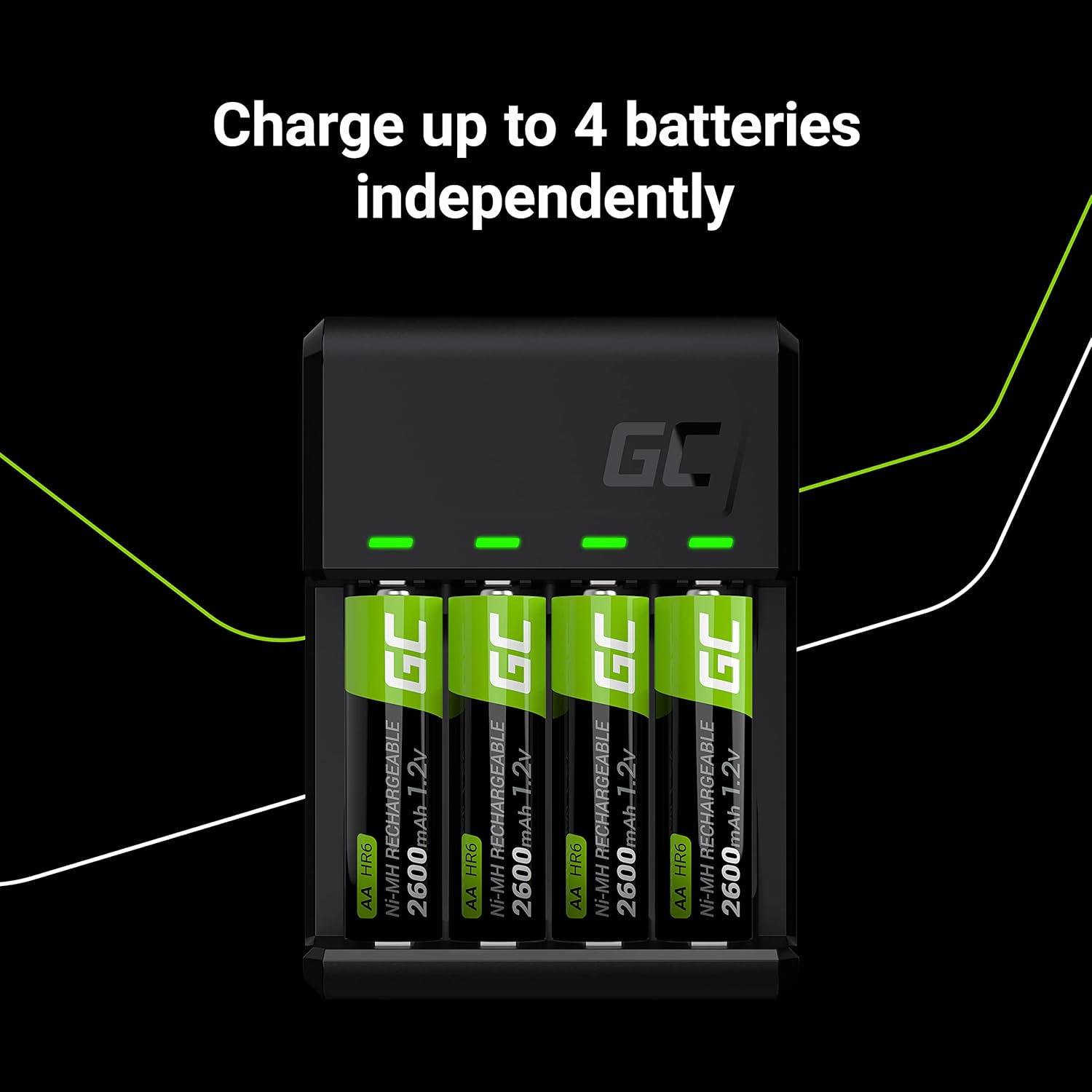 Зарядно устройство Green Cell VitalCharger + 2 x AA 2000 mAh + 2 x AAA 800 mAh за NI-MH AA AAA R6 R03 Mignon батерии. С Micro USB-C. 4-канална система за зареждане - зарежда от 1 до 4 AA или AAA батерии, LED сигнализация.