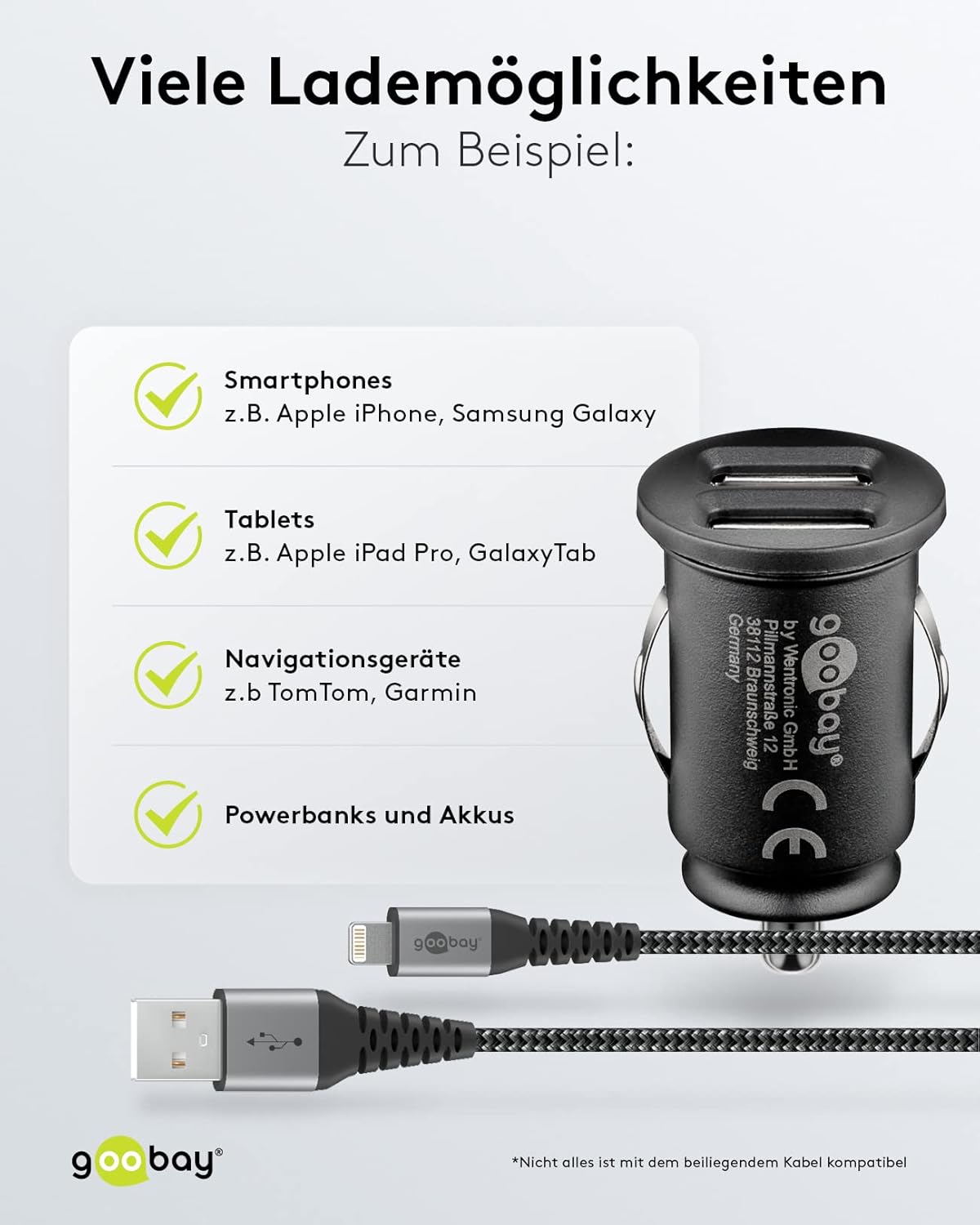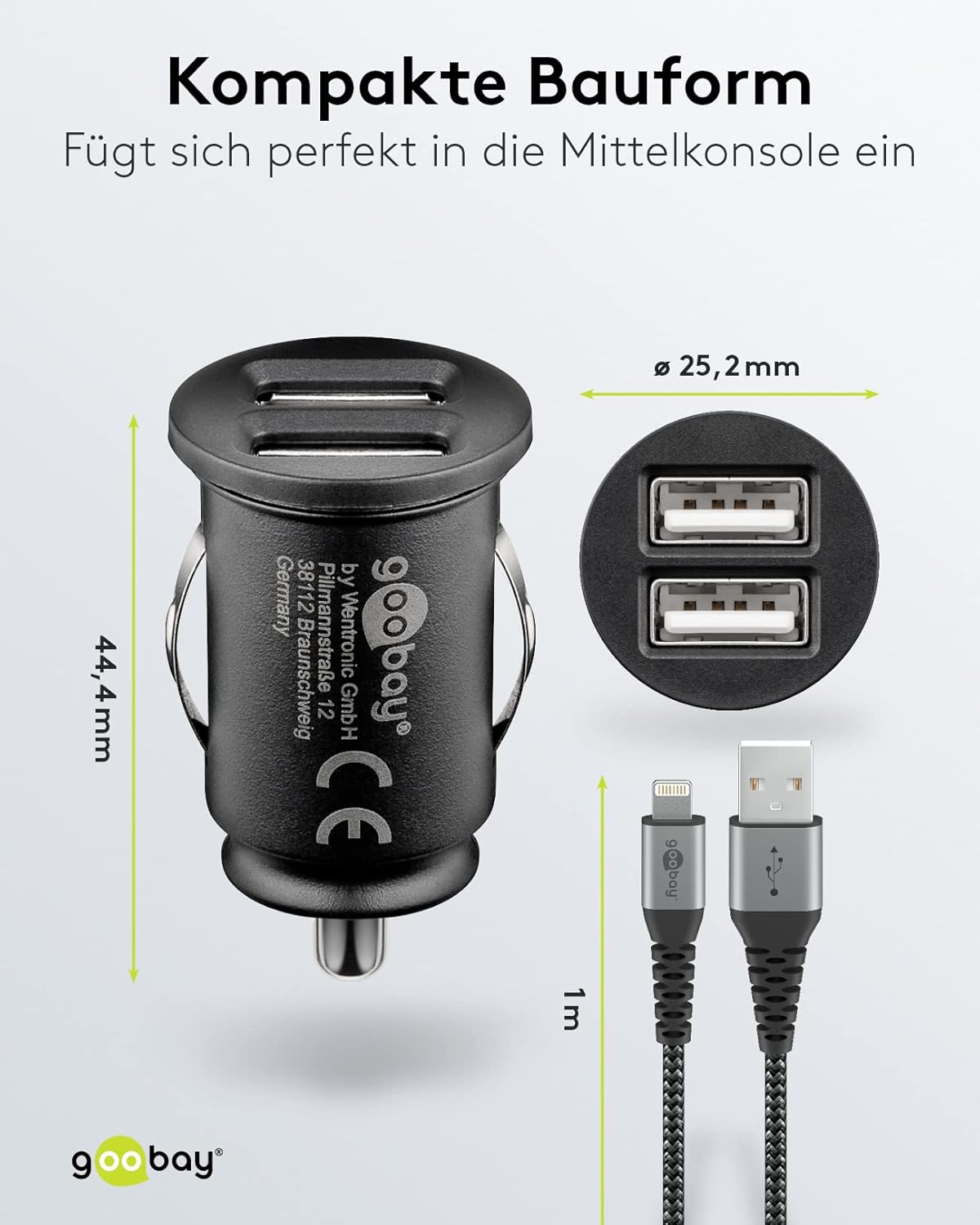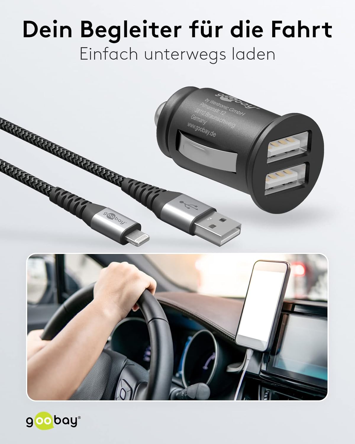 Зарядно за кола Goobay 64801 с 2 порта и USB порт за запалка 2.4 A - Двоен USB адаптер за запалка - Двойно зарядно за кола - Подходящо за автомобили и камиони (12 V / 24 V) с 1 м Lightning кабел