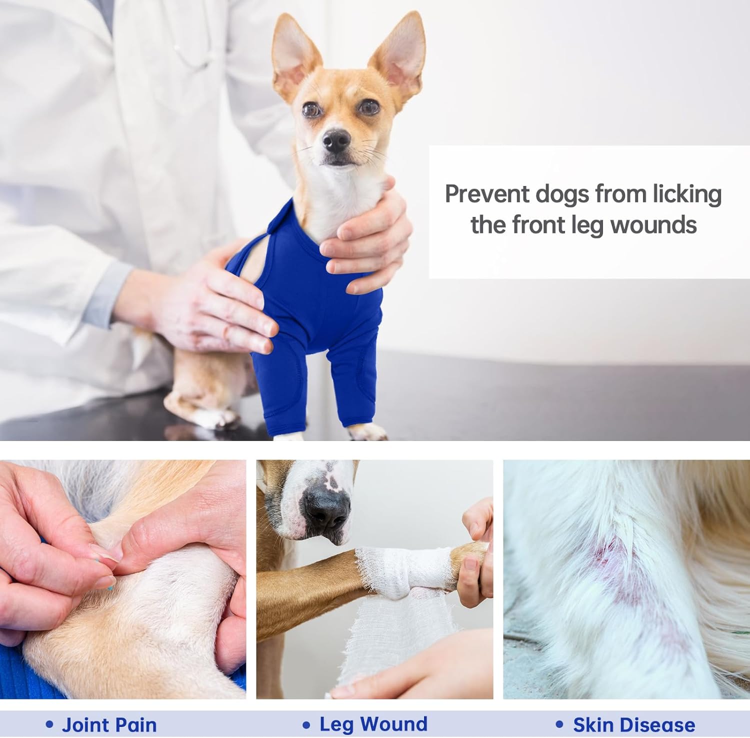 • [Алтернатива на конуса] Защитата за рани по краката на кучетата е чудесна алтернатива на конуса след операция. Хирургичният костюм за кучета може да предотврати облизването на рани по предните им крака от страна на кучето, а също така позволява на кучето ви да се движи по-свободно, без да бъде ограничено, докато се храни, спи и играе.