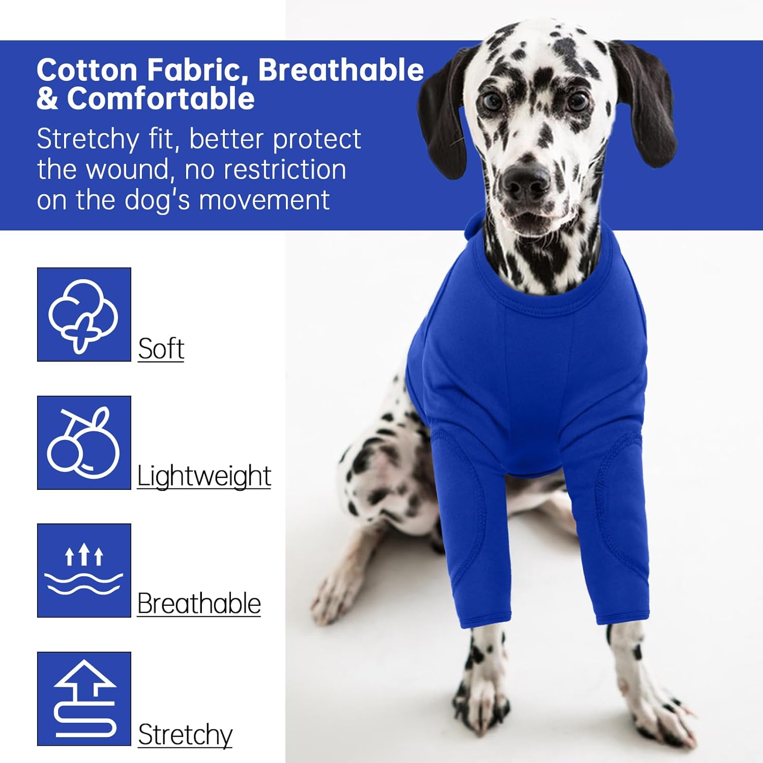 • 【Защита за предните крака】Нашият костюм за възстановяване на кучета е изработен от мек, еластичен памук, който се приспособява към тялото на вашето куче, осигурявайки оптимален комфорт и защита. Протекторите за крака могат да предотвратят облизването на кучетата и да предпазят ставите, раните, огнищата, инфекциите и кожните проблеми.