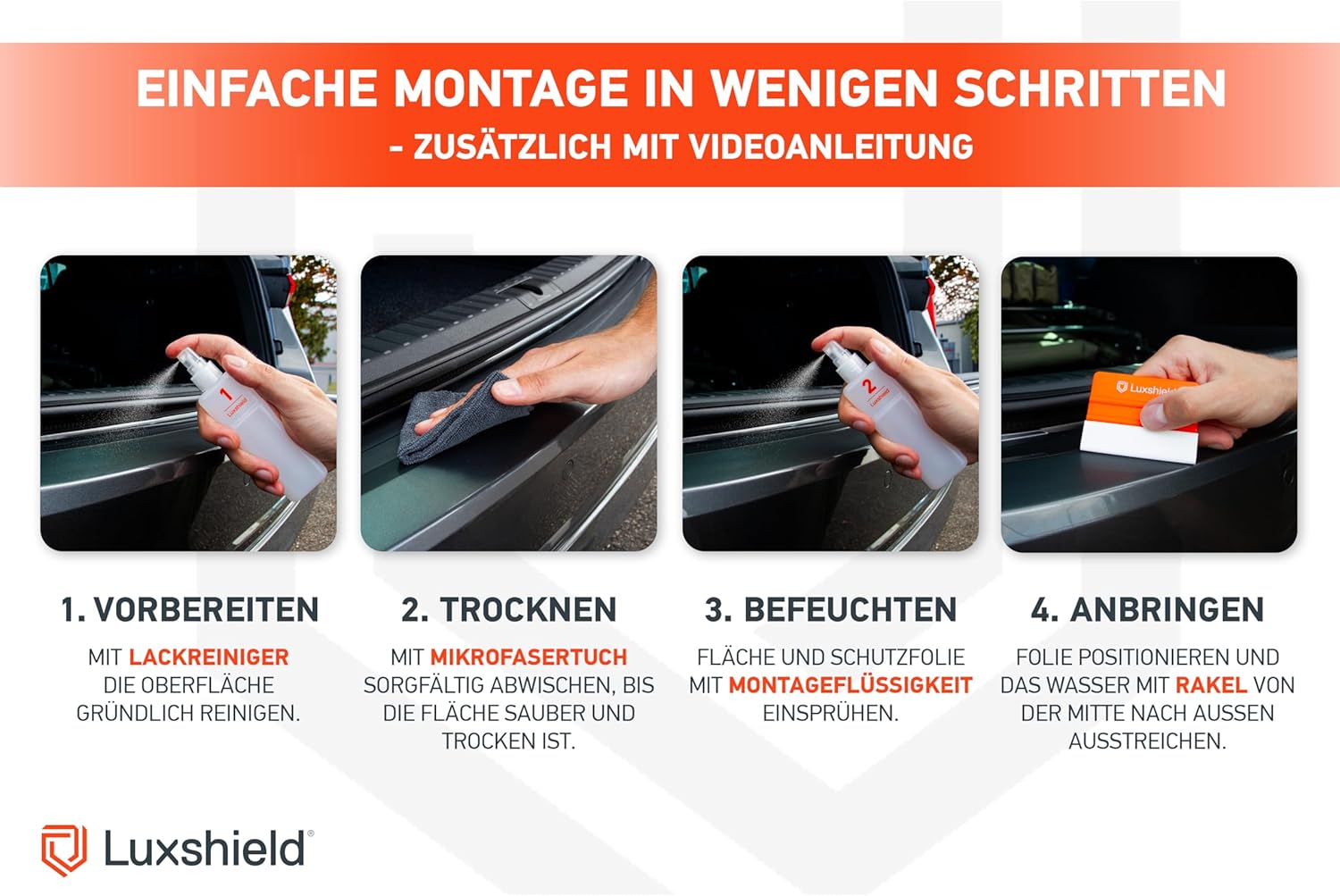 • Пълен комплект: с нашия практичен комплект аксесоари можете да започнете веднага след разопаковане. Съдържа: микрофибърна кърпа, почистващ препарат за боя, монтажна течност, гумена шпатула