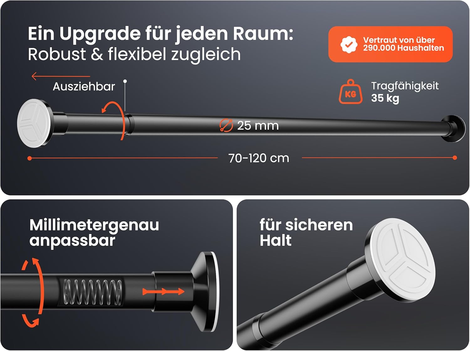 • Стабилност: Останете в безопасност с противоплъзгащи постелки 2.0 и превъзходна конструкция, която гарантира, че вашата завеса ще остане на мястото си на всяка повърхност. Нашият телескопичен прът е изработен от най-съвременни материали за максимална функционалност и издръжливост.