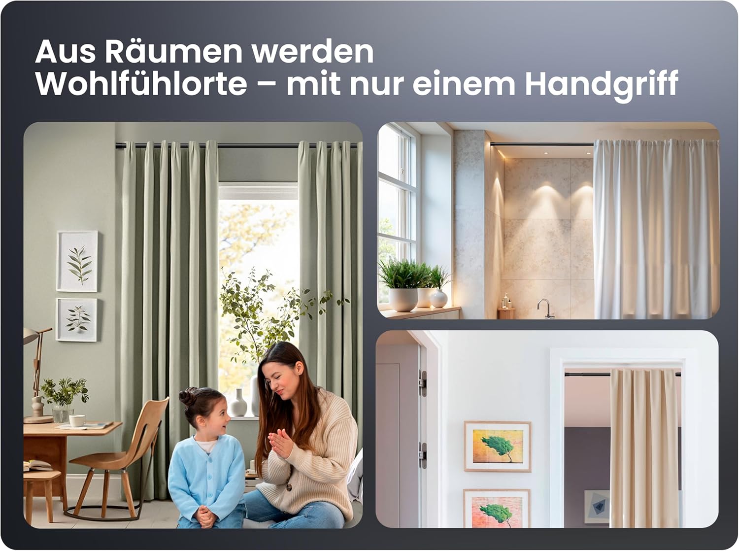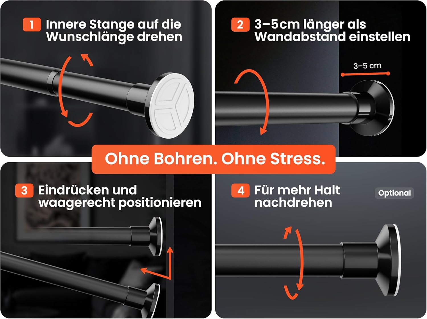 • Лесен монтаж и универсално прилягане: трансформирайте всяка стая за минути с този регулируем прът за опъване без пробиване - не са необходими инструменти. Телескопичният прът за завеси се регулира безпроблемно до желаната дължина и гарантира перфектно прилягане навсякъде, от кухнята до банята. Изпитайте простотата на корниз за завеси без пробиване за бързи и безвредни обновявания.
