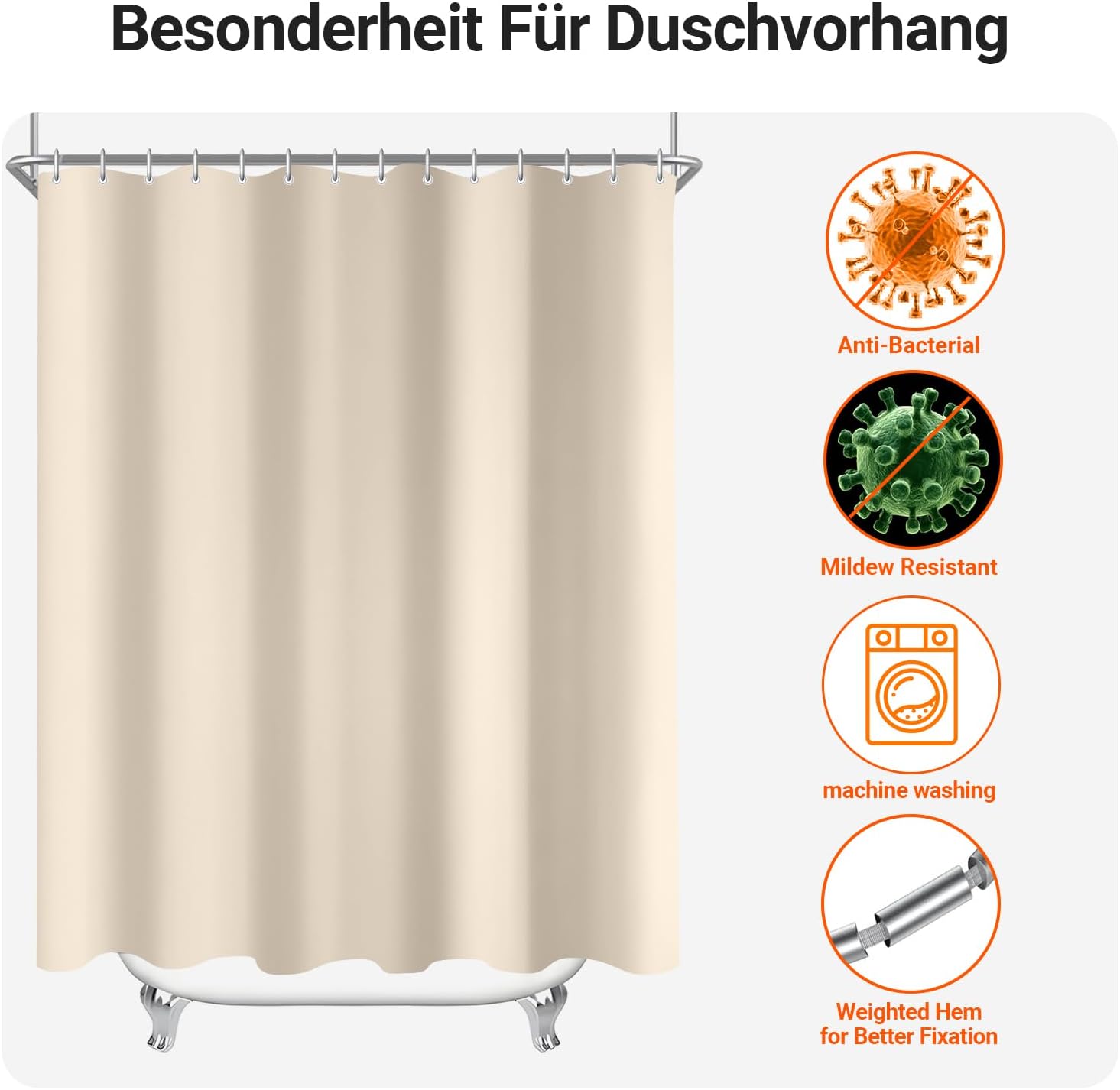 • Лесен монтаж: Тази завеса за душ е снабдена с 12 пластмасови кукички, включените кукички позволяват лесно окачване на тази завеса за баня. Долен подгъв с тежести: Допълнителен шев с надеждно закрепен подгъв в долната част. Включете струята под високо налягане. Предотвратете залепването на завесата за баня по тялото ви, когато се къпете.