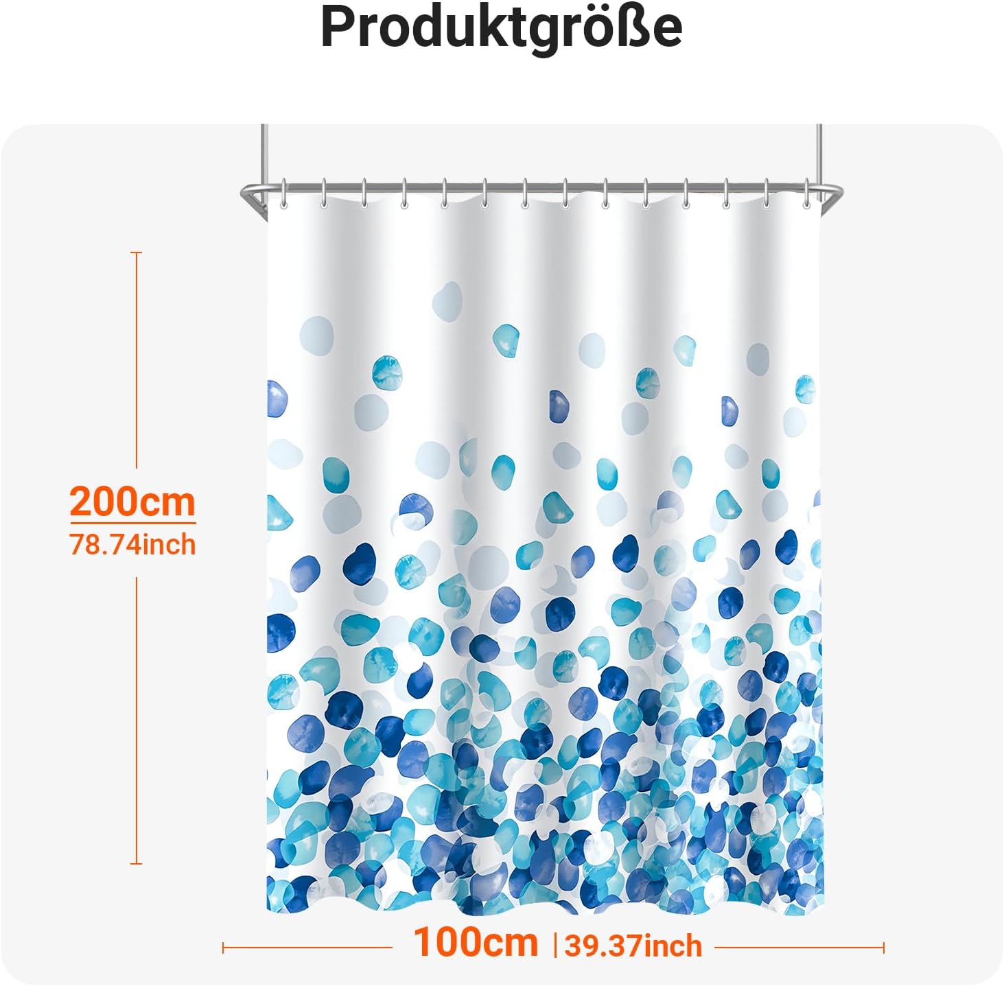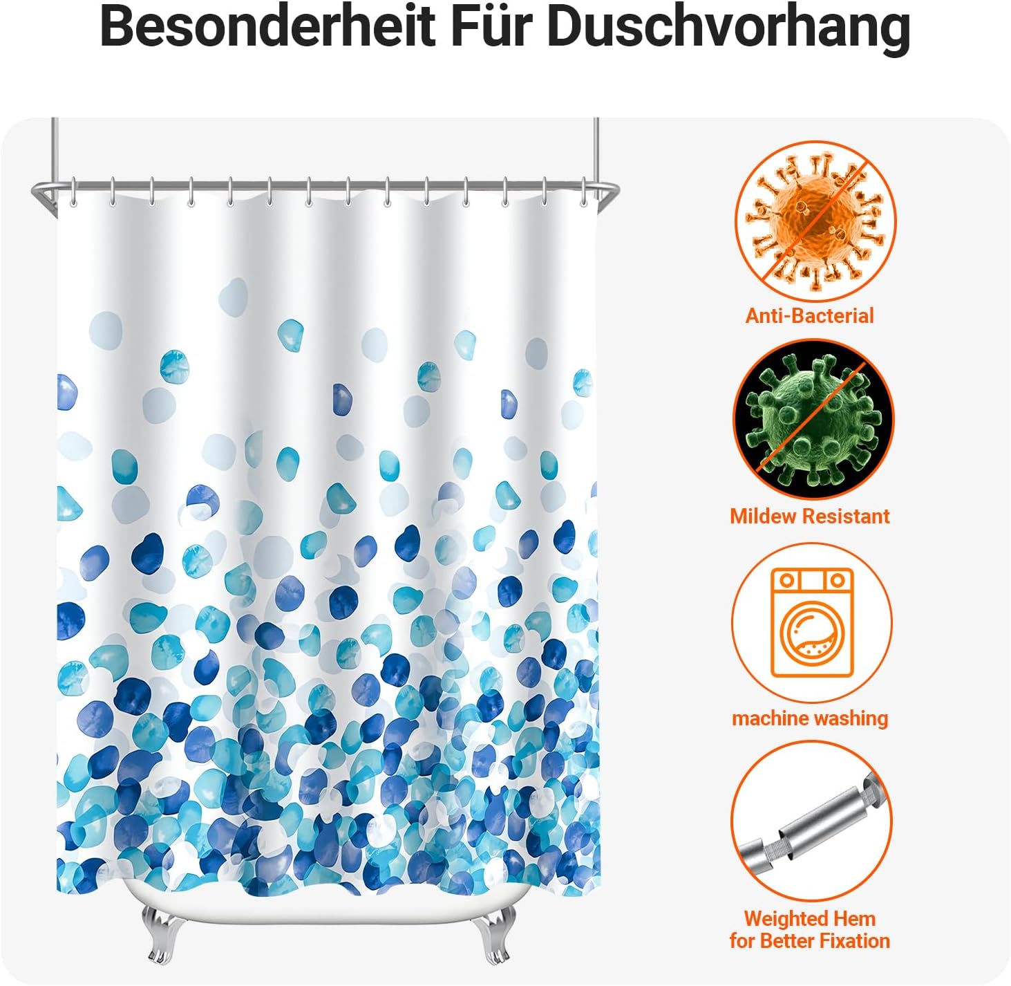 • Лесен монтаж: Тази завеса за душ е снабдена с 12 пластмасови кукички, включените кукички позволяват лесно окачване на тази завеса за баня. Долен подгъв с тежести: Допълнителен шев с надеждно закрепен подгъв в долната част. Включете струята под високо налягане. Предотвратете залепването на завесата за баня по тялото ви, когато се къпете.